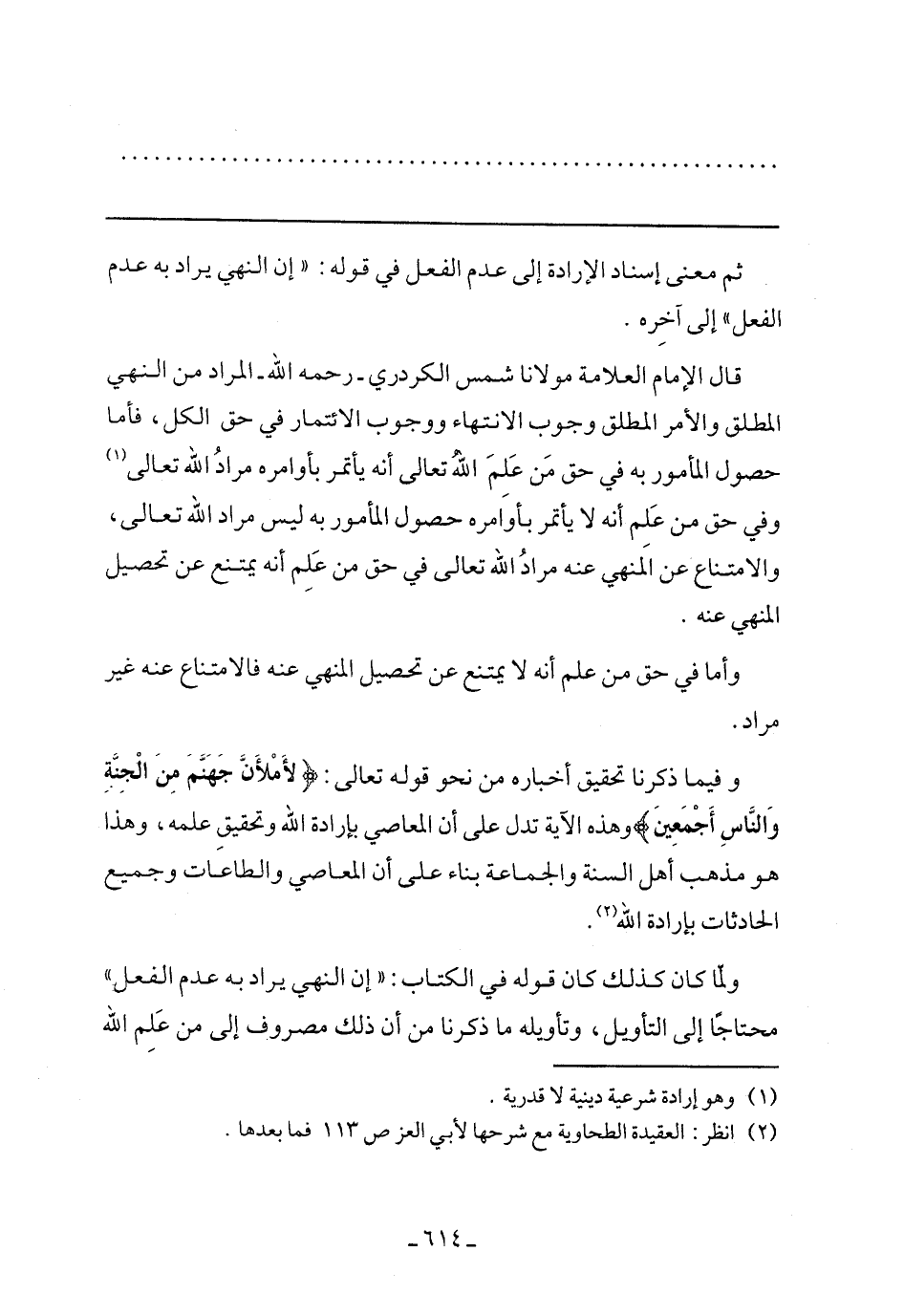 قال الإمام العلامة مولانا شمس الكردري-رحمه الله- المراد من النهي المطلق والأمر المطلق وجوب الانتهاء ووجوب الائتمار في حق الكل، فأما حصول المأمور به في حق من علم الله تعالى أنه يأتمر بأوامره مراد الله تعالى وفي حق من علم أنه لا يأتمر بأوامره حصول المأمور به ليس مراد الله تعالى، والامتناع عن المنهي عنه مراد الله تعالى في حق من علم أنه يمتنع عن تحصيل المنهي عنه.