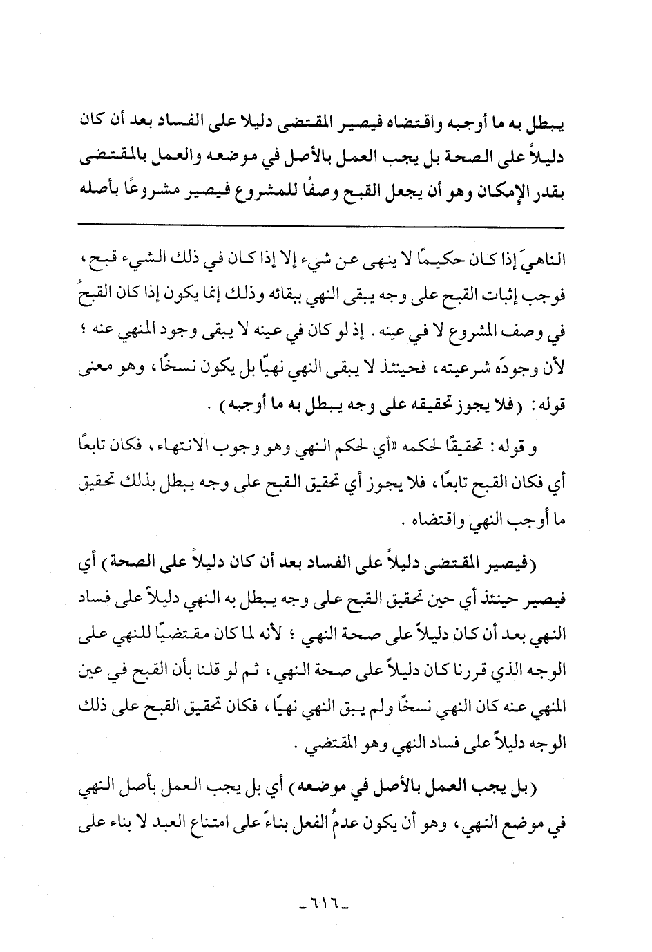 وقوله: تحقيقًا لحكمه (أي لحكم النهي وهو وجوب الانتهاء، فكان تابعًا أي فكان القبح تابعًا، فلا يجوز أي تحقيق القبح على وجه يبطل بذلك تحقيق ما أوجب النهي واقتضاه.