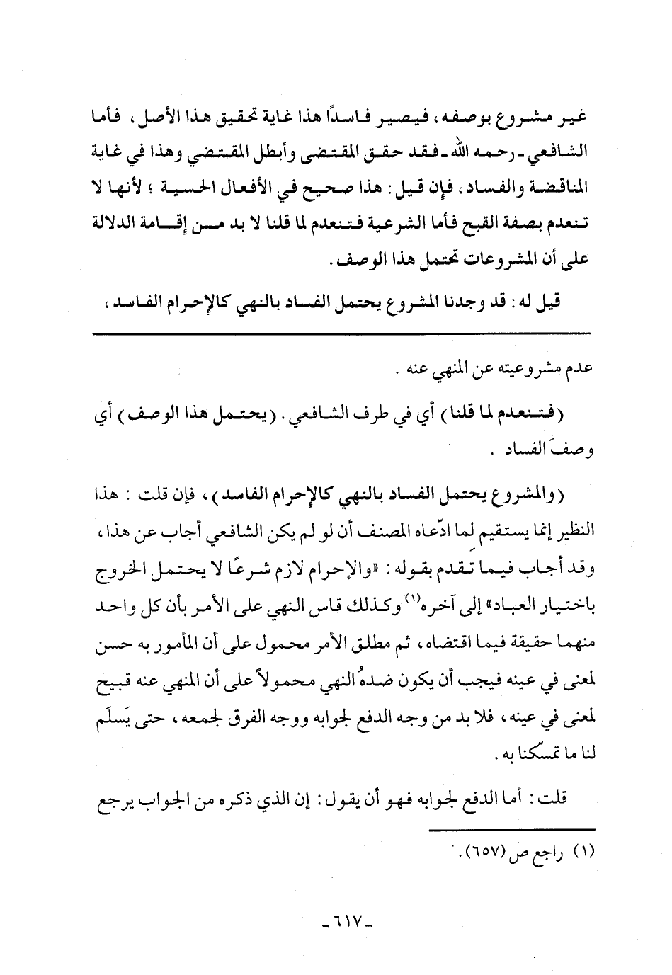 (والمشروع يحتمل الفساد بالنهي كالإحرام الفاسد)، فإن قلت: هذا النظير إنما يستقيم لما ادعاه المصنف أن لو لم يكن الشافعي أجاب عن هذا، وقد أجاب فيما تقدم بقوله: (والإحرام لازم شرعًا لا يحتمل الخروج باختيار العباد) إلى آخره وكذلك قاس النهي على الأمر بأن كل واحد منهما حقيقة فيما اقتضاه، ثم مطلق الأمر محمول على أن المأمور به حسن لمعنى في عينه فيجب أن يكون ضده النهي محمولًا على أن المنهي عنه قبيح لمعنى في عينه، فلا بد من وجه الدفع لجوابه ووجه الفرق لجمعه، حتى يسلم لنا ما تمسكنا به.