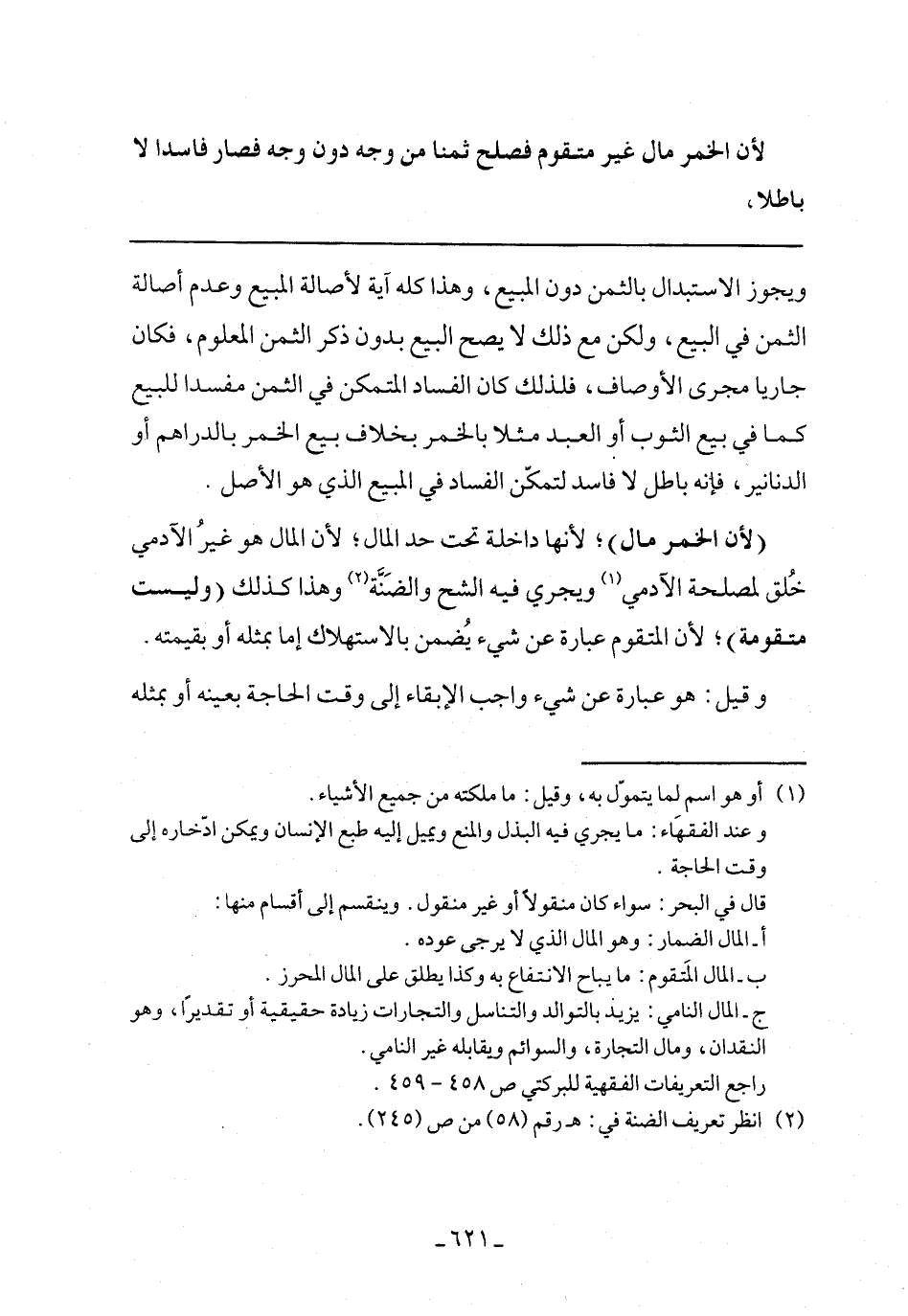 ويجوز الاستبدال بالثمن دون المبيع، وهذا كله آية لأصالة المبيع وعدم أصالة الثمن في البيع، ولكن مع ذلك لا يصح البيع بدون ذكر الثمن المعلوم، فكان جاريا مجرى الأوصاف، فلذلك كان الفساد المتمكن في الثمن مفسدًا للبيع كما في بيع الثوب أو العبد مثلا بالخمر بخلاف بيع الخمر بالدراهم أو الدنانير، فإنه باطل لا فاسد لتمكن الفساد في المبيع الذي هو الأصل.