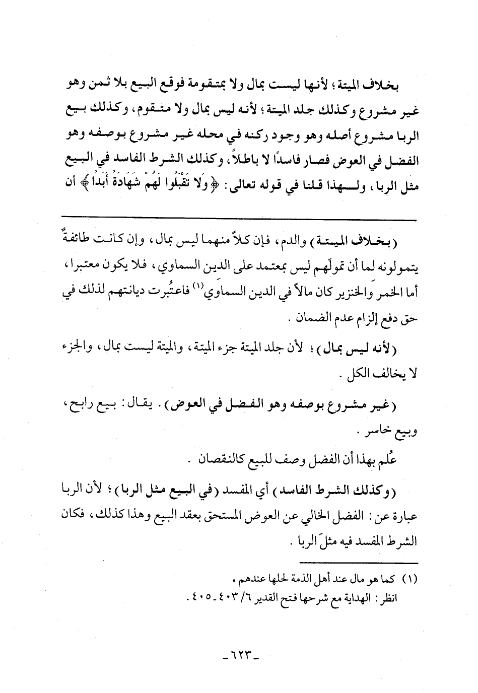 (بخلاف الميتة) والدم، فإن كلًا منهما ليس بمال، وإن كانت طائفة يتمولونه لما أن تمولهم ليس بمعتمد على الدين السماوي، فلا يكون معتبرا، أما الخمر والخنزير كان مالًا في الدين السماوي فاعتبرت ديانتهم لذلك في حق دفع إلزام عدم الضمان.