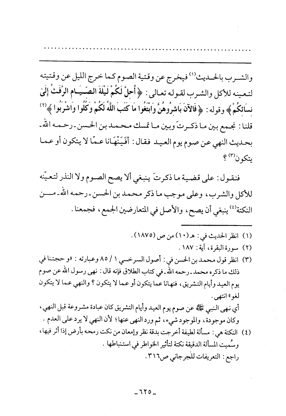 فنقول: على قضية ما ذكرت ينبغي ألا يصح الصوم ولا النذر لتعينه للأكل والشرب، وعلى موجب ما ذكر محمد بن الحسن-رحمه الله- من النكتة ينبغي أن يصح، والأصل في المتعارضين الجمع، فجمعنا.