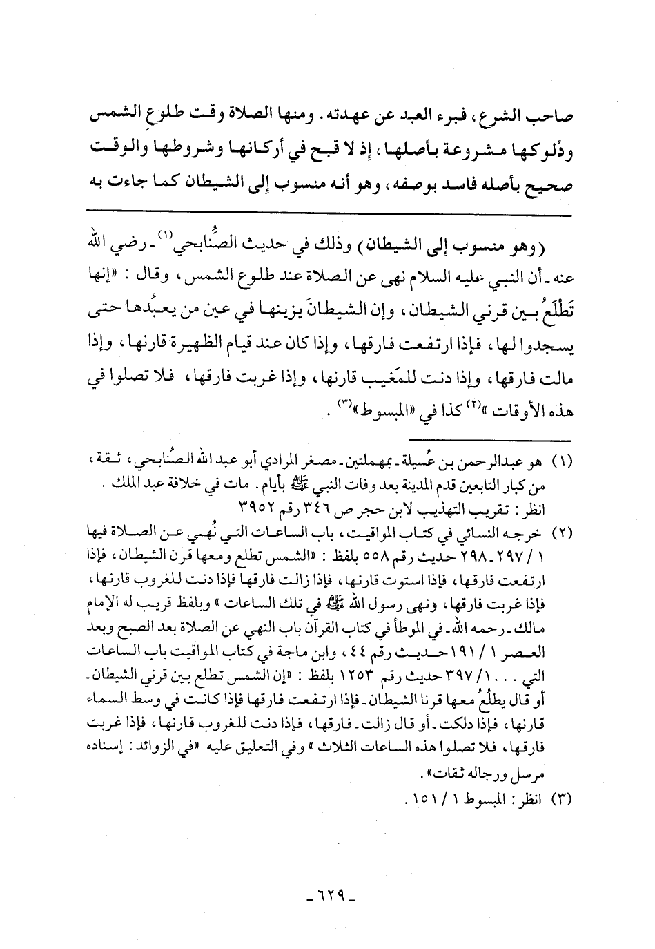(وهو منسوب إلى الشيطان) وذلك في حديث الصنابحي- رضي الله عنه- أن النبي عليه السلام نهى عن الصلاة عند طلوع الشمس، وقال: (إنها تطلع بين قرني الشيطان، وإن الشيطان يزينها في عين من يعبدها حتى يسجدوا لها، فإذا ارتفعت فارقها، وإذا كان عند قيام الظهيرة قارنها، وإذا مالت فارقها، وإذا دنت للمغيب قارنها، وإذا غربت فارقها، فلا تصلوا في هذه الأوقات) كذا في (المبسوط).