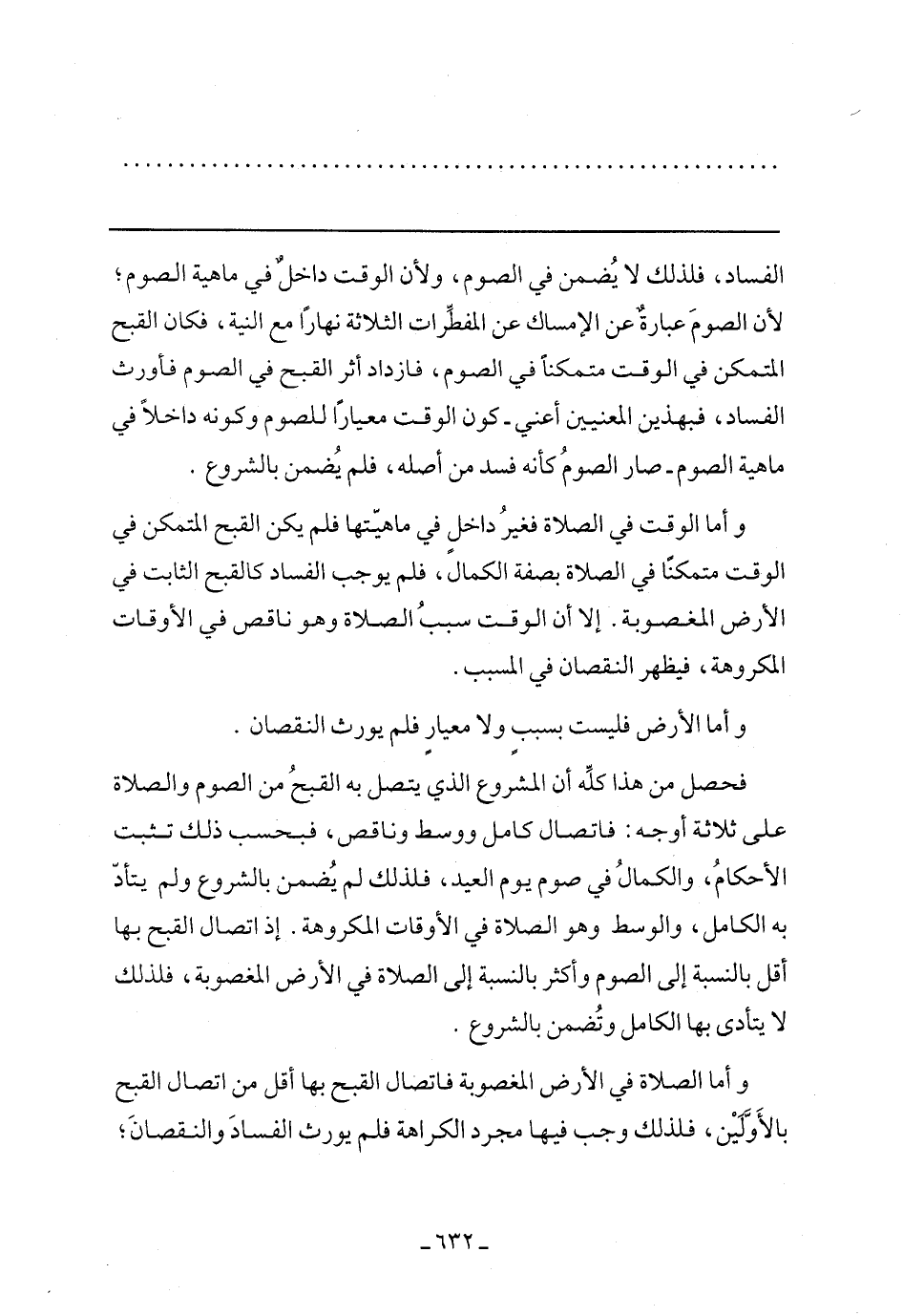 فحصل من هذا كله أن المشرع الذي يتصل به القبح من الصوم والصلاة على ثلاثة أوجه: فاتصال كامل ووسط وناقص، فبحسب ذلك تثبت الأحكام، والكمال في الصوم يوم العيد، فذلك فلم يضمن بالشروع ولم يتأد به الكامل، والوسط وهو الصلاة في الأوقات المكروهة. إذ اتصال القبح بها اقل بالنسبة إلى الصوم وأكثر بالنسبة إلى الصلاة في الأرض المغصوبة، فلذلك لا يتأدى بها الكامل وتضمن بالشروع.