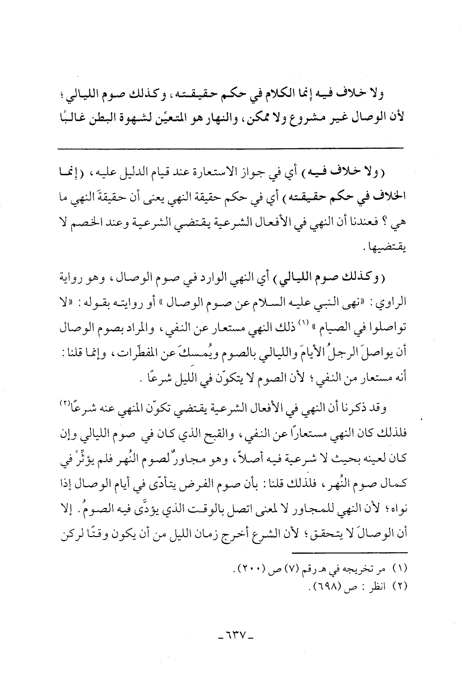 وقد ذكرنا أن النهي في الأفعال الشرعية يقتضي تكون المنهي عنه شرعًا فلذلك كان النهي مستعارًا عن النفي، والقبح الذي كان في صوم الليالي وإن كان لعينه بحيث لا شرعية فيه أصلًا، وهو مجاور لصوم النهر فلم يؤثر في كمال صوم النهر، فلذلك قلنا: بأن صوم الفري يتأدى في أيام الوصال إذا نواه، لأن النهي للمجاور لا لمعنى اتصل بالوقت الذي يؤدى فيه الصوم. إلا أن الوصال لا يتحقق؛ لأن الشرع أخرج زمان الليل من أن يكون وقتًا لركن