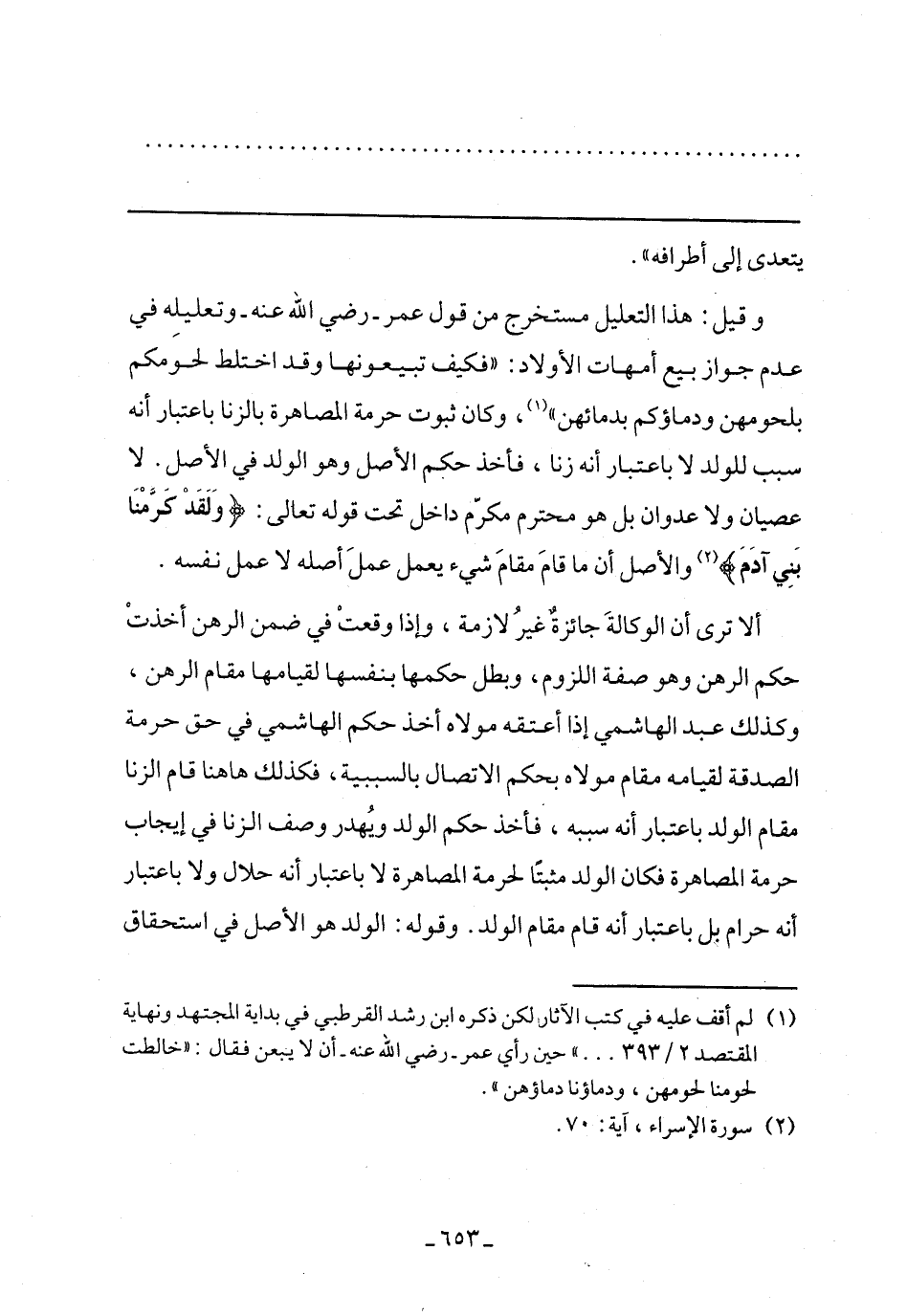 وقيل: هذا التعليل مستخرج من قول عمر- رضي الله عنه- وتعليله في عدم جواز بيع أمهات الأولاد: "فكيف تبيعونها وقد أختلط لحومكم بلحومهن ودماؤكم بدمائهن"، وكان ثبوت حرمة المصاهرة بالزنا باعتبار أنه سبب للولد لا باعتبار أنه زنا، فأخذ حكم الأصل وهو الولد في الأصل. لا عصيان ولا عدوان بل هو محترم مكرم داخل تحت قوله تعالى:} وَلَقَدْ كَرَّمْنَا بَنِي آدَم {والأصل أن ما قام مقام شيء يعمل عمل أصله لا عمل نفسه.