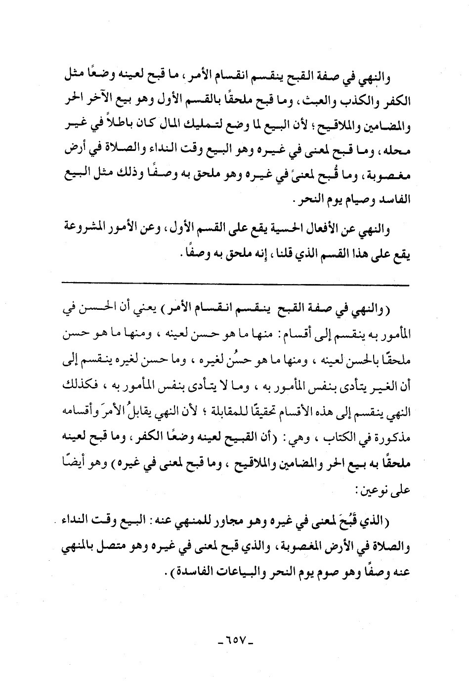 (الذي قبح لمعنى في غيره وهو مجاور للمنهي عنه: البيع وقت النداء والصلاة في الأرض المغصوبة، والذي قبح لمعنى في غيره وهو متصل بالمنهي عنه وصفًا وهو صوم يوم النحر والبياعات الفاسدة).