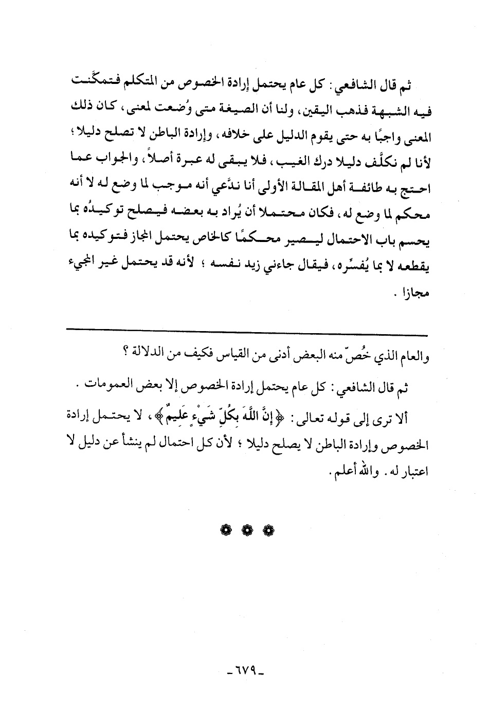 ثم قال الشافعي: كل عام يحتمل إرادة الخصوص إلا بعض العمومات.