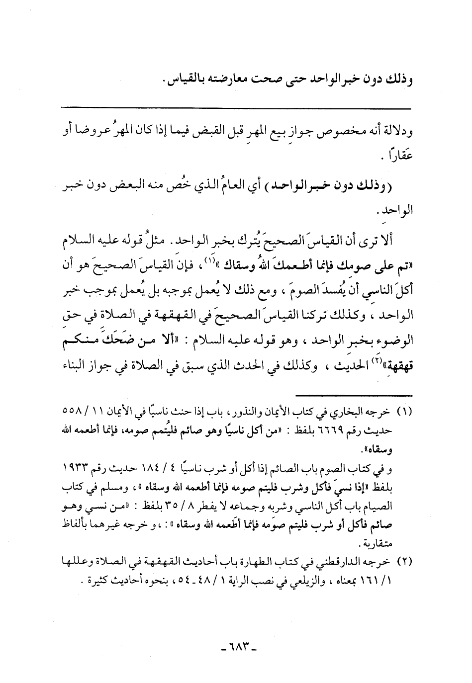 ألا ترى أن القياس الصحيح يترك بخبر واحد. مثل قوله عليه السلام "تم على صومك فإنما أطعمك الله وسقاك"، فإن القياس الصحيح هو أن أكل الناسي أن يفسد الصوم، ومع ذلك لا يعمل بموجبه بل يعمل بموجب خبر الواحد، وكذلك تركنا القياس الصحيح في القهقهة في الصلاة في حق الوضوء بخبر الواحد، وهو قوله عليه السلام: "ألا من ضحك منكم قهقهة" الحديث، وكذلك في الحدث الذي سبق في الصلاة في جواز البناء.