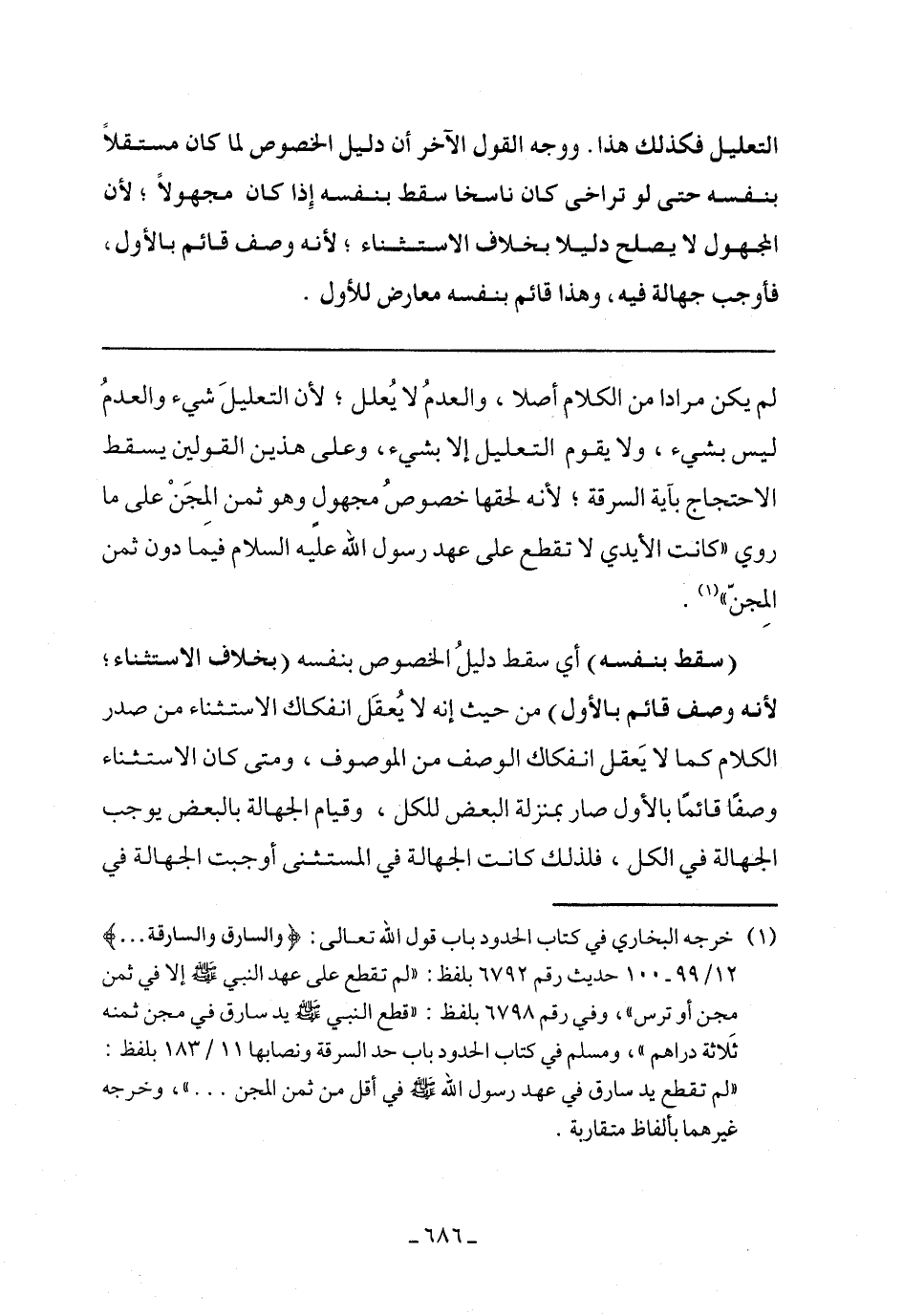 لم يكن مرادًا من الكلام أصلا، والعدم لا يعلل؛ لأن لتعليل شيء والعدم ليس بشيء، ولا يقوم التعليل إلا بشيء، وعلى هذين القولين يسقط الاحتجاج بآية السرقة؛ لأنه لحقها خصوص مجهول وهو ثمن المجن على ما روى "كانت الأيدي لا تقطع على عهد رسول الله عليه السلام فيما دون ثمن المجن".