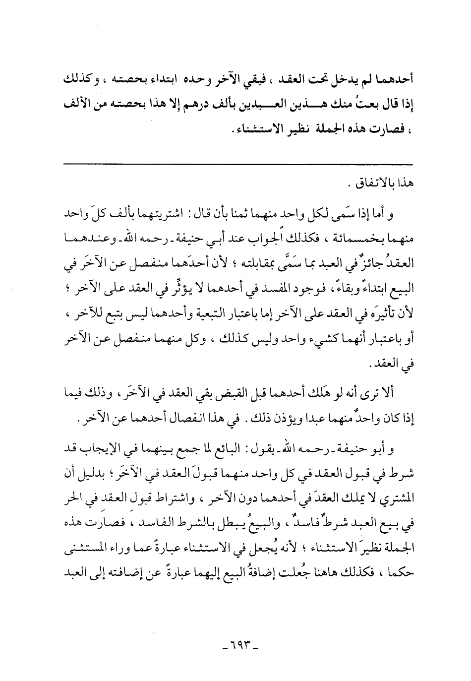 وأبو حنيفة- رحمه الله- يقول: البائع لما جمع بينهما في الإيجاب وقد شرط في قبول العقد في كل واحد منهما قبول العقد في الآخر؛ بدليل أن المشتري لا يلك العقد في أحدهما دون الآخر، واشتراط قبول العقد في الحر في بيع العبد شرط فاسد، والبيع يبطل بالشرط الفاسد، فصارت هذه الجملة نظير الاستثناء؛ لأنه يجعل في الاستثناء عبارة عما وراء المستثنى حكمًا، فكذلك هاهنا جعلت إضافة البيع إليهما عبارة عن إضافته إلى العبد