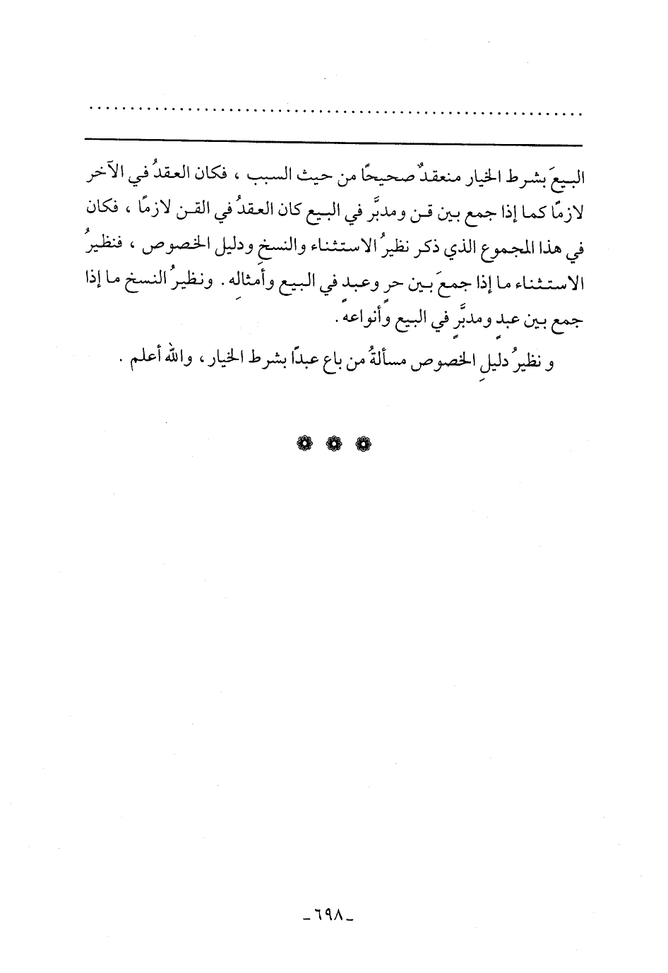 البيع بشرط الخيار منعقد صحيحًا من حيث السبب، فكان العقد في الآخر لازمًا كما إذا جمع بين قن ومدبر في البيع كان العقد في القن لازمًا، فكان في هذا المجموع الذي ذكر نظير الاستثناء والنسخ دليل الخصوص، فنظير الاستثناء ما إذا جمع بين حر وعبد في البيع وأمثاله. ونظير النسخ ما إذا جمع بين عبد ومدبر في البيع وأنواعه.