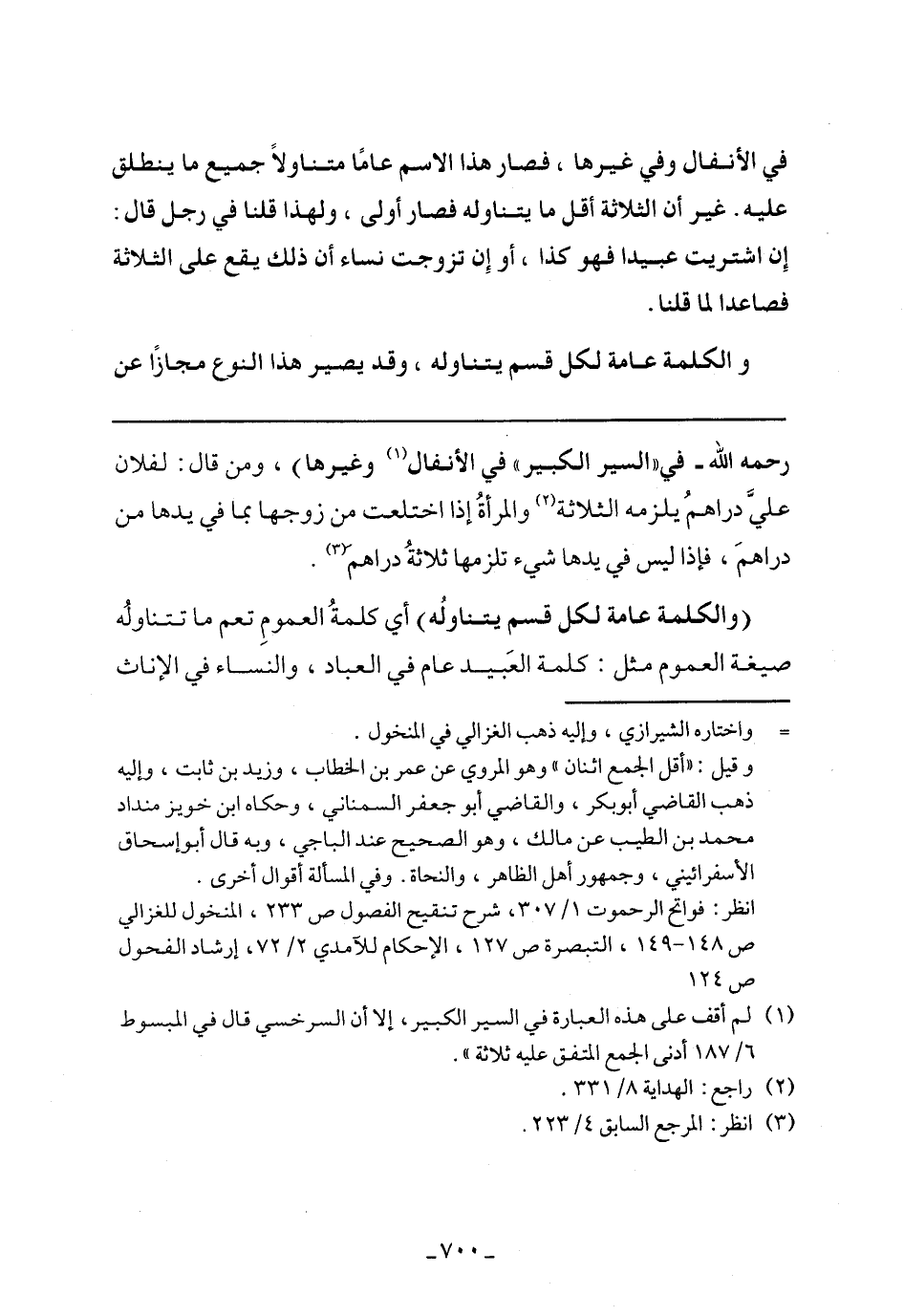 رحمه الله- في "السير الكبير" في الأنفال ويرها)، ومن قال: لفلان علي دراهم يلزمه الثلاثة والمرأة إذا اختلعت من زوجها بما في يدها من دراهم، فإذا ليس في يدها شيء تلزمها ثلاثة دراهم.