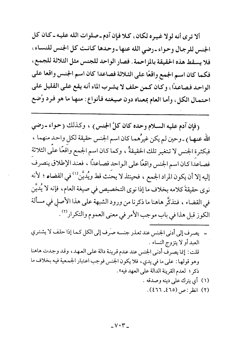 (فإن آدم عليه السلام وحده كان كل الجنس)، وكذلك (حواء- رضي الله عنها) - وحين لم يكن غيرهما كان اسم الجنس حقيقة لكل واحد منهما، فبكثرة الجنس لا تتغير تلك الحقيقة، وكما كان اسم الجمع واقعًا على الثلاثة فصاعدًا كان اسم الجنس واقعًا على الواحد فصاعدًا، فعند الإطلاق ينصرف إليه إلا أن يكون المراد الجمع، فحينئذ لا يحنث فقط ويدين في القضاء؛ لأنه نوى حقيقة كلامه بخلاف ما إذا نوى التخصيص في صيغة العام، فإنه لا يدين في القضاء، فتذكر هاهنا ما ذكرنا من ورود الشبهة على هذا الأصل في مسألة الكوز قبل هذا في باب موجب الأمر في معنى العموم والتكرار.