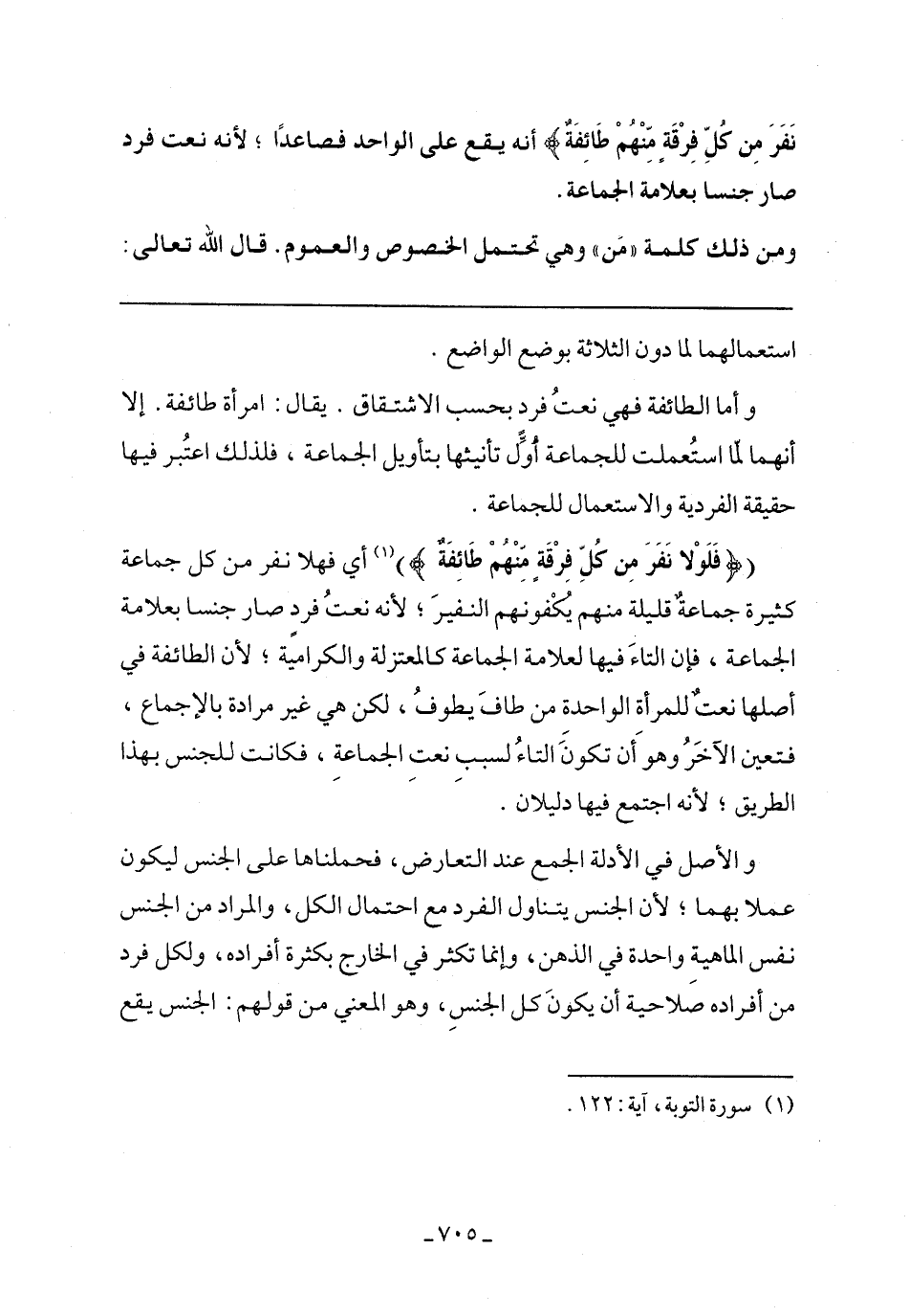 ({فَلَوْلَا نَفَرَ مِنْ كُلِّ فِرْقَةٍ مِنْهُمْ طَائِفَةٌ}) أي فهلا نفر من كل جماعة كثيرة جماعة قليلة منهم يكفونهم النفير؛ لأنه نعت فرد صار جنسا بعلامة الجماعة، فإن التاء فيها لعلامة الجماعة كالمعتزلة والكرامية؛ لأن الطائفة في أصلها نعت للمرأة الواحدة من طاف يطوف، لكن هي غير مرادة بالإجماع، فتعين الآخر وهو أن تكون التاء لسبب النعت الجماعة، فكانت للجنس بهذا الطريق؛ لأنه اجتمع فيها دليلان.