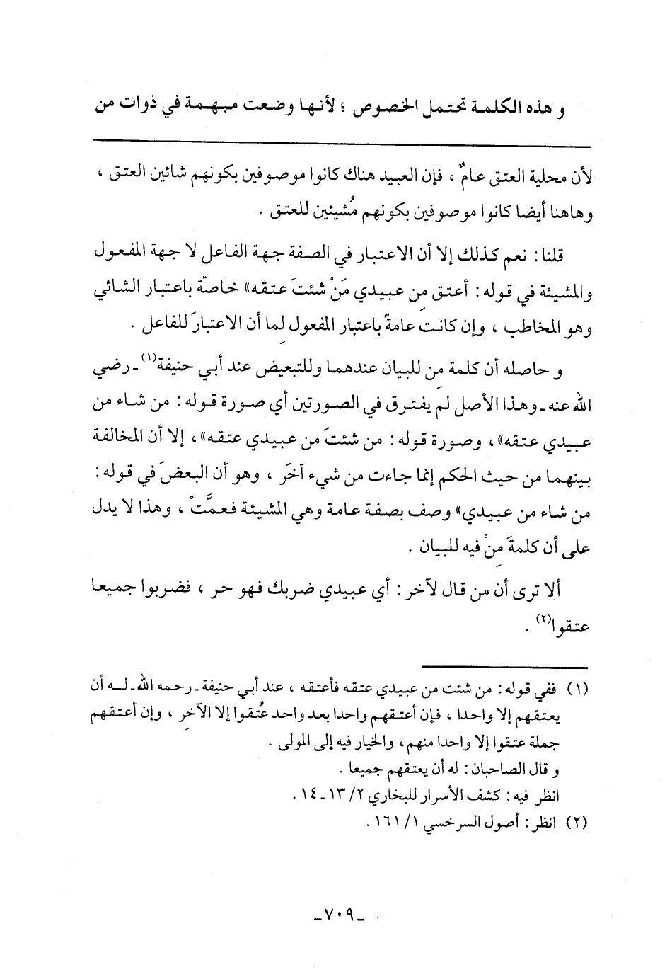 وحاصله أن كلمة من للبيان عندهما وللتبعيض عند أبي حنيفة- رضي الله عنه- وهذا الأصل لم يفترق في الصورتين أي صورة قوله: من شاء من عبيدي عتقه"، وصورة قوله: من شيءت من عبيدي عتقه"، إلا أن المخالفة بينهما من حيث الحكم إنما جاءت من شيء آخر، وهو أن البعض في قوله: من شاء من عبيدي" وصف بصفة عامة وهي المشيئة فعمت، وهذا لا يدل على أن كلمة من فيه للبيان.