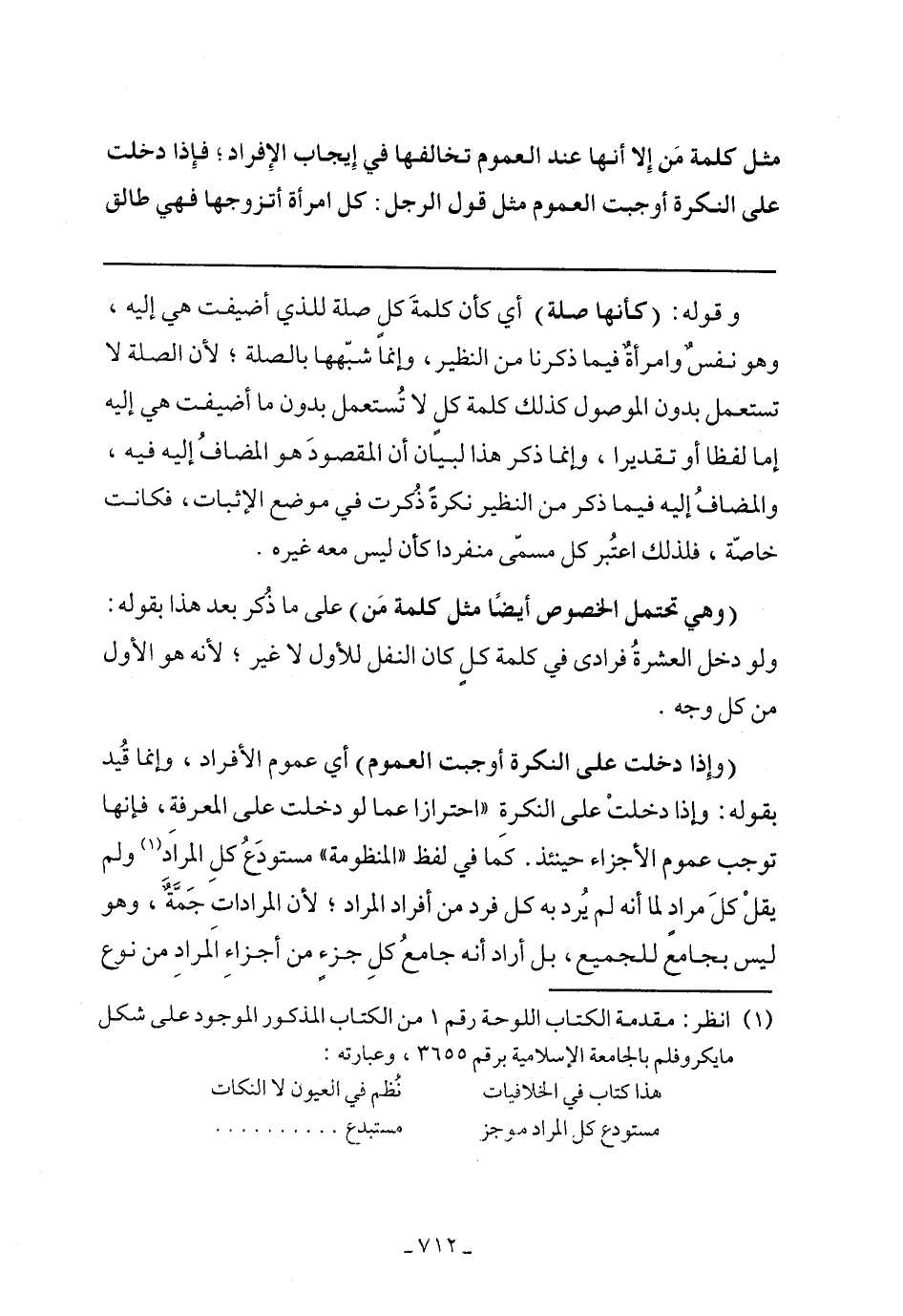 (وإذا دخلت على النكرة أوجبت العموم) أي عموم الأفراد، وإنما قيد بقوله: وإذا دخلت على النكرة "احترازا عما لو دخلت على المعرفة، فإنها توجب عموم الأجزاء حينئذ. كما في لفظ "المنظومة" مستودع كل المراد ولم يقل كل مراد لما أنه لم يرد به كل فرد من أفراد المراد؛ لأن المرادات جمة، وهو ليس بجامع للجميع، بل أراد أنه جامع كل جزء من أجزاء المراد من نوع