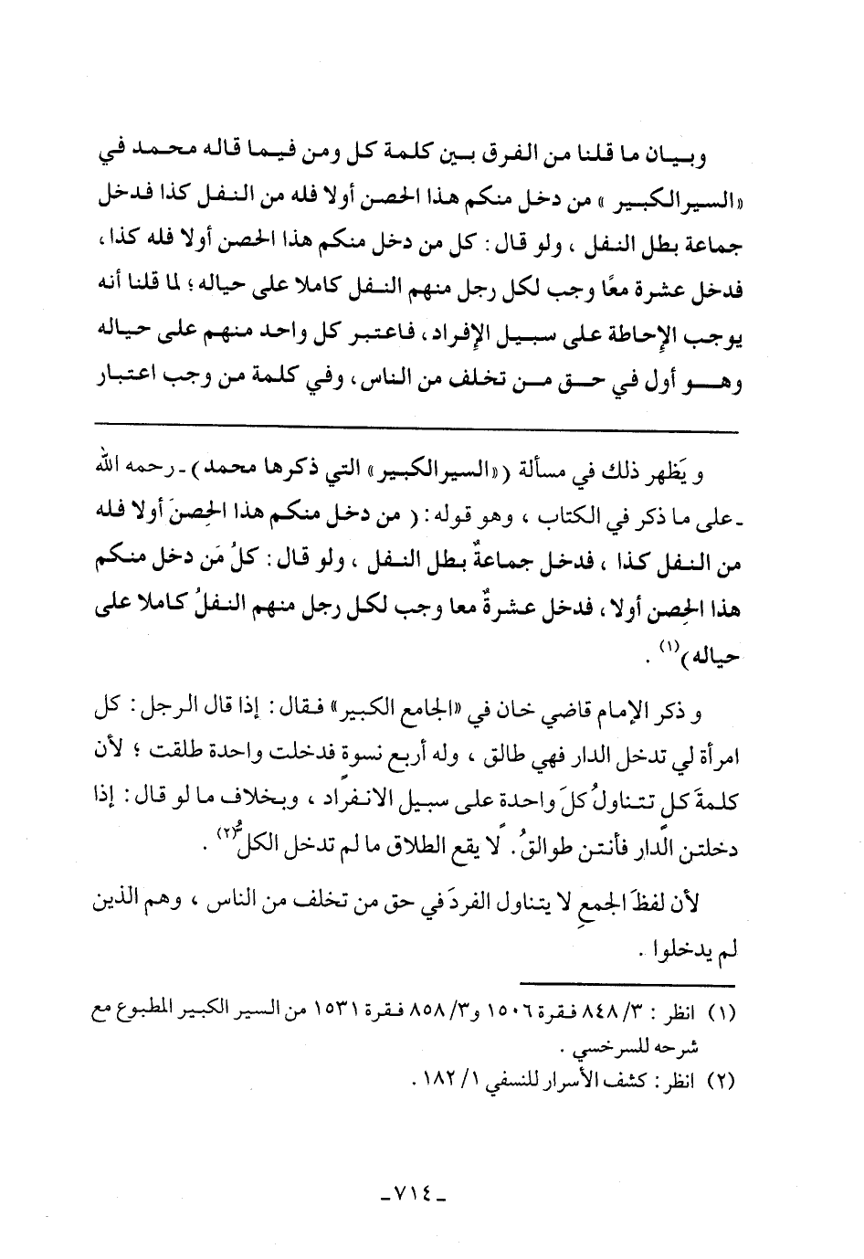 ويظهر ذلك في مسألة ("السير الكبير" التي ذكرها محمد) - رحمه الله- على ما ذكر في الكتاب، وهو قوله: (من دخل منكم هذا الحصن أولا فله من النفل كذا، فدخل جماعة بطل النفل، ولو قال: كل من دخل منكم هذا الحصن أولا، فدخل عشرة معا وجب لكل رجل منهم النفل كاملا على حياله).