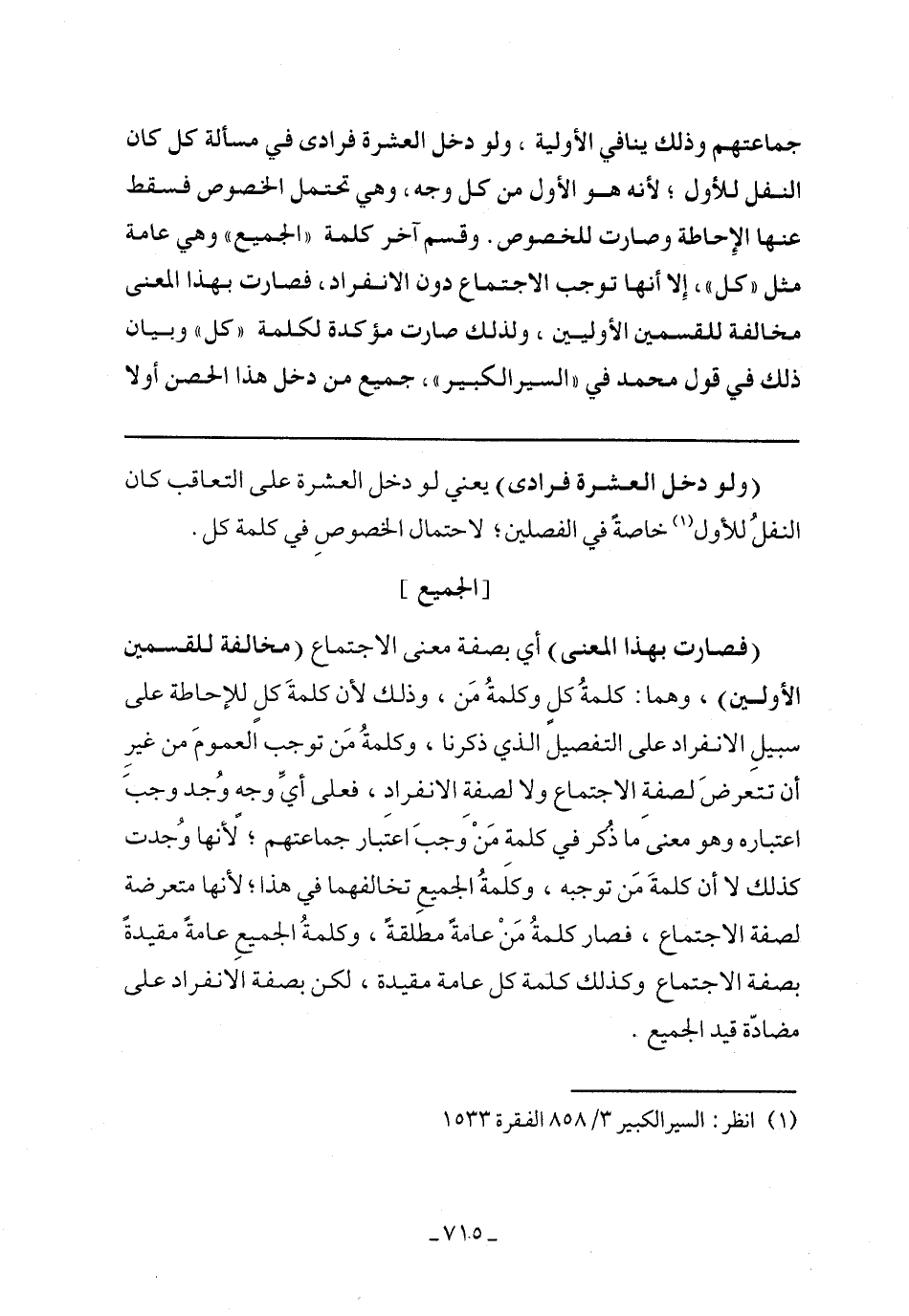(فصارت بهذا المعنى) أي بصفة معنى الاجتماع (مخالفة للقسمين الأولين)، وهما: كلمة كل وكلمة من، وذلك لأن كلمة للإحاطة على سبيل الانفراد على التفصيل الذي ذكرنا، وكلمة من توجب العموم من غير أن تتعرض لصفة الاجتماع ولا لصفة الانفراد، فعلى أي وجه وجد وجب اعتباره وهو معنى ما ذكر في كلمة من وجب اعتبار جماعتهم؛ لأنها وجدت كذلك لا أن كلمة من توجبه، وكلمة الجميع تخالفهما في هذا؛ لأنها متعرضة لصفة الاجتماع، فصار كلمة من عامة مطلقة، وكلمة الجميع عامة مقيدة بصفة الاجتماع وكذلك كلمة كل عامة مقيدة، لكن بصفة الانفراد على مضادة قيد الجميع.