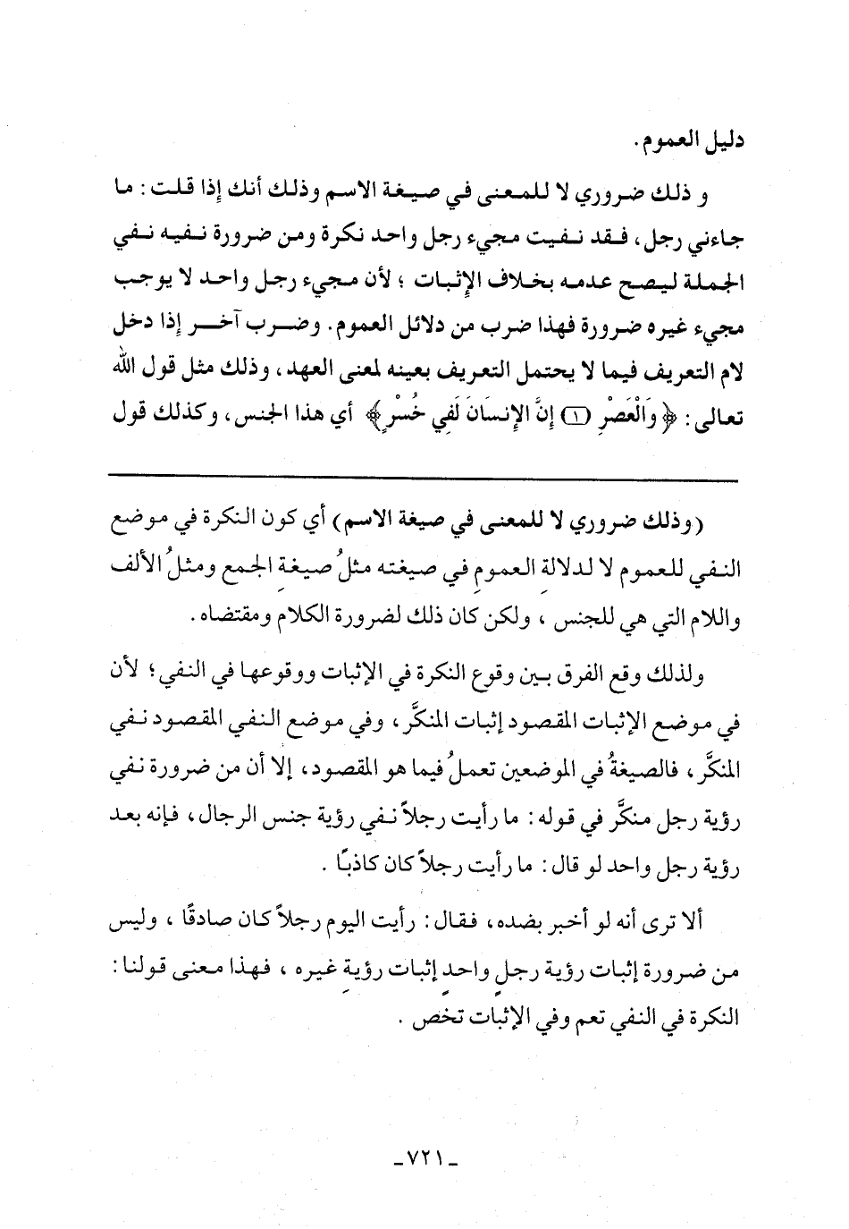 ولذلك وقع الفرق بين وقوع النكرة في الإثبات ووقوعها في النفي؛ لأن في موضع الإثبات المقصود إثبات المنكر، وفي موضع النفي المقصود نفي المنكر، فالصيغة في الموضوعين تعمل فيما هو المقصود، إلا أن من ضرورة نفي رؤية رجل منكر في قوله: ما رأيت رجلا نفي رؤية جنس الرجال، فإنه بعد رؤية رجل واحد لو قال: ما رأيت رجلا كان كاذبًا.