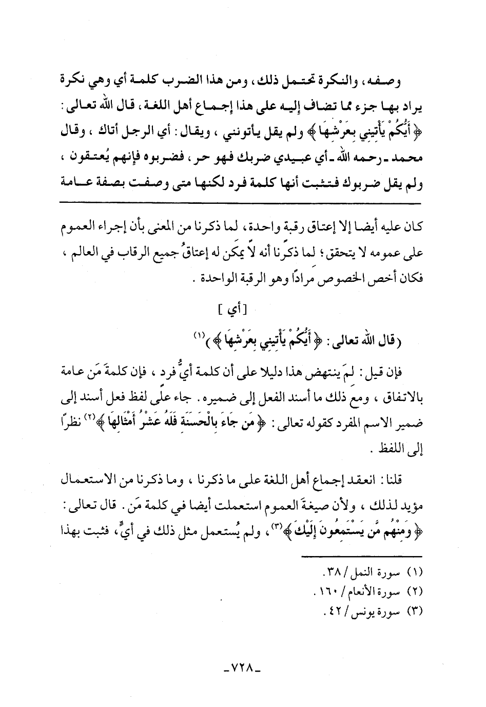 فإن قيل: لم ينتهض هذا دليل على أن كلمة أي فرد، فإن كلمة من عامة بالاتفاق، ومع ذلك ما أسند الفعل إلى ضميره. جاء على لفظ فعل أسند إلى ضمير الاسم المفرد كقوله تعالى: {مَنْ جَاءَ بِالْحَسَنَةِ فَلَهُ عَشْرُ أَمْثَالِهَا} نظرًا إلى اللفظ.