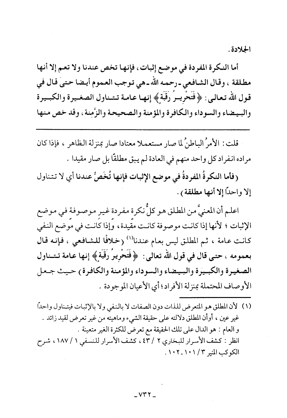 اعلم أن المعنى من المطلق هو كل نكرة مفردة غير موصوفة في موضع الإثبات؛ لأنها إذا كانت موصوفة كانت مقيدة، وإذا كانت في موضع النفي كانت عامة، ثم المطلق ليس بعام عندنا (خلافًا للشافعي، فإنه قال بعمومه، حتى قال في قول الله تعالى: {فَتَحْرِيرُ رَقَبَةٍ} إنها عامة تتناول الصغيرة والكبيرة والبيضاء والسوداء المؤمنة والكافرة) حيث جعل الأوصاف المحتملة بمنزلة الأفراد؛ أي الأعيان الموجودة.