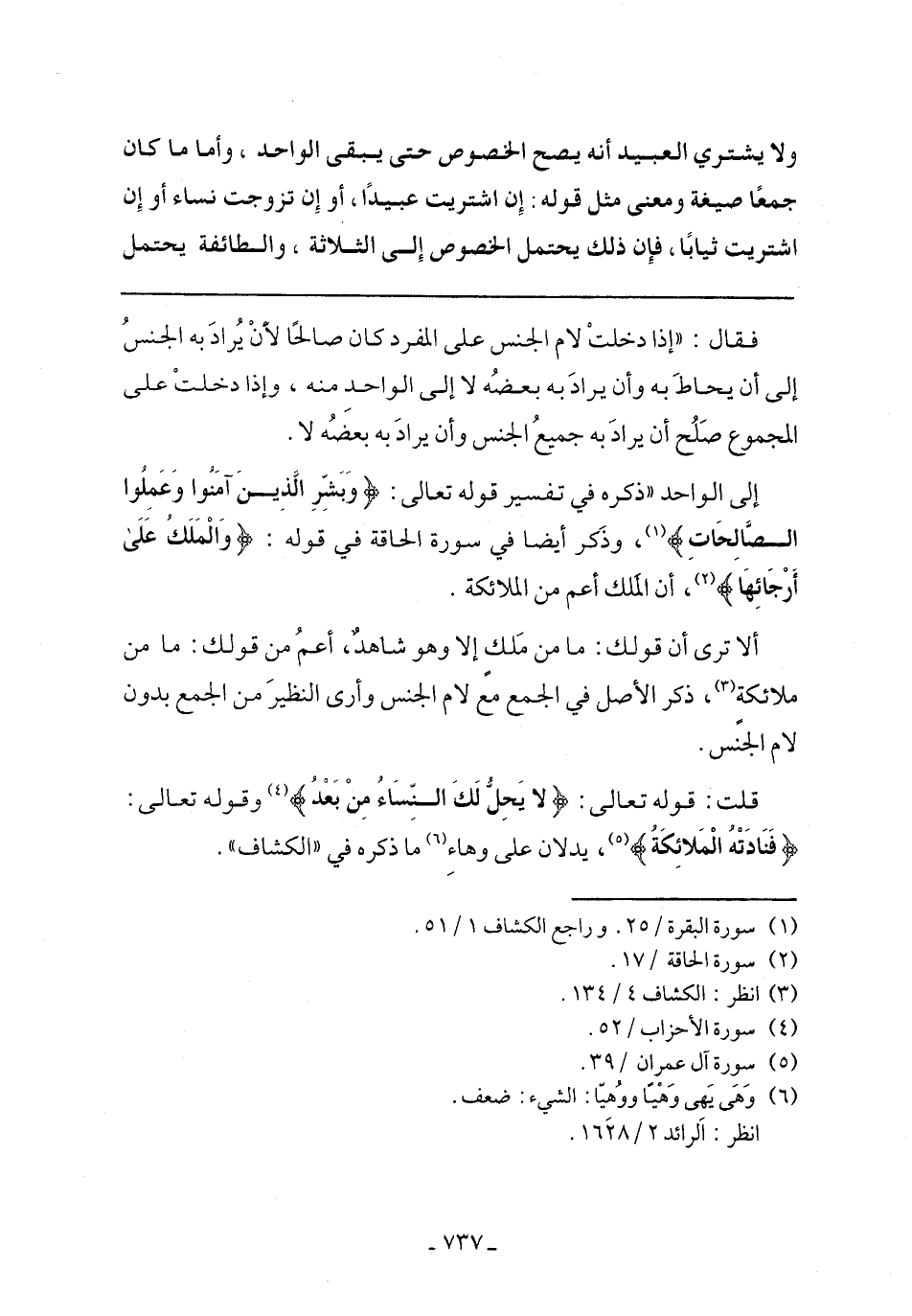 ألا ترى أن قولك: ما من ملك إلا وهو شاهد، أعم من قولك: ما من ملائكة، ذكر الأصل في الجمع مع لام الجنس وأرى النظير من الجمع بدون لام الجنس.