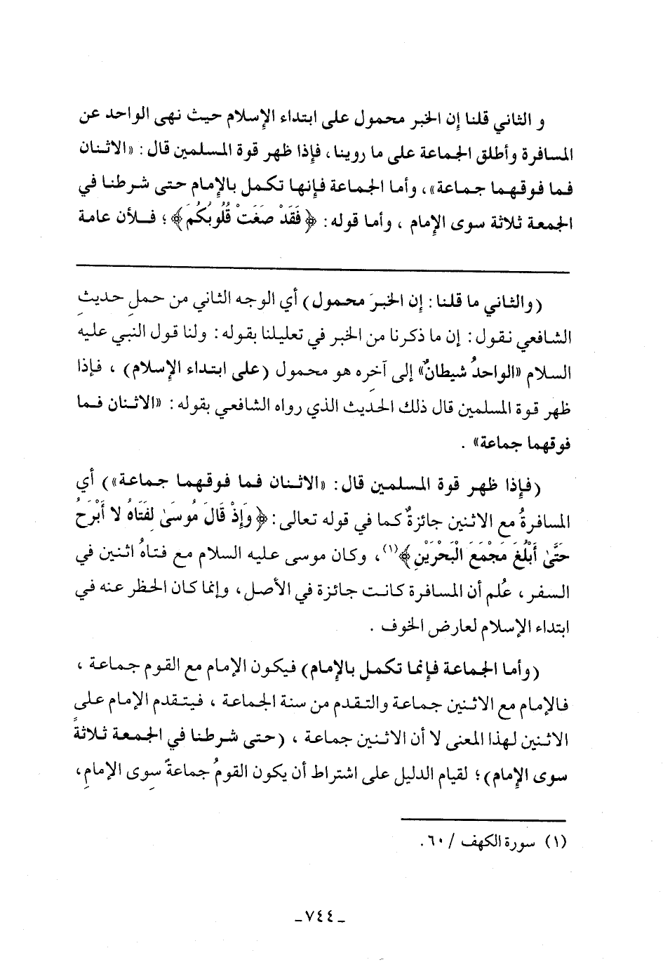 (فإذا ظهر قوة المسلمين قال: "الاثنان فما فوقهما جماعة") أي المسافرة مع الاثنين جائزة كما في قوله تعالى: {وَإِذْ قَالَ مُوسَى لِفَتَاهُ لَا أَبْرَحُ حَتَّى أَبْلُغَ مَجْمَعَ الْبَحْرَيْنِ}، وكان موسى عليه السلام مع فتاه اثنين في السفر، علم أن المسافرة كانت جائزة في الأصل، وإنما كان الحظر عنه في ابتداء الإسلام لعارض الخوف.