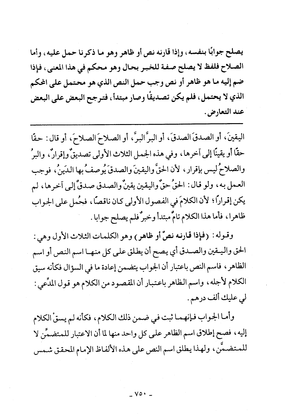 وقوله: (فإذا قارنه نص أو ظاهر) وهو الكلمات الثلاث الأول وهي: الحق واليقين والصدق أي يصح أن يطلق على كل منها اسم النص أو اسم الظاهر، فاسم النص باعتبار أن لجواب يتضمن إعادة ما في السؤال فكأنه سيق الكلام لأجله، واسم الظاهر باعتبار أن المقصود من الكلام هو قول المدعي: لي عليك ألف درهم.