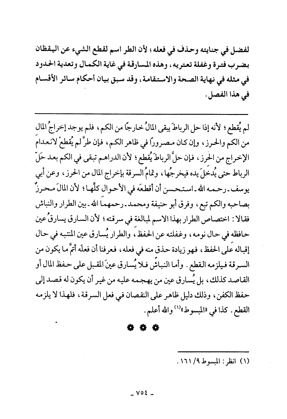 لم يقطع؛ لأنه إذا حل الرباط يبقى المال خارجًا من الكم، فلم يوجد إخراج المال من الكم والحرز، وإن كان مصرورًا في ظاهر الكم، فإن طر لم يقطع لانعدام الإخراج من الحرز، فإن حل الرباط يقطع؛ لأن الدراهم تبقى في الكم بعد حل الرباط حتى يدخل يده فيخرجها، وتمام السرقة بإخراج المال من الحرز، وعن أبي يوسف- رحمه الله- استحسن أن أقطعه في الأحوال كلها؛ لأن المال محرز بصاحبه والكم تبع، وفرق أبو حنيفة ومحمد- رحمهما الله- بين الطرار والنباش فقالا: اختصاص الطرار بهذا الاسم لمبالغة في سرقته؛ لأن السارق يسارق عين حافظه في حال نومه، وغفلته عن الحفظ، والطرار يسارق عين المنتبه في حال إقباله على الحفظ، فهو زيادة حذق منه في فعله، فعرفنا أن فعله أتم ما يكون من السرقة فيلزمه القطع. وأما النباش فلا يسارق عين المقبل على حفظ المال أو القاصد كذلك، بل يسارق عين من يهجمه عليه من غير أن يكون له قصد إلى حفظ الكفن، وذلك دليل ظاهر على النقصان في فعل السرقة، فلهذا لا يلزمه القطع. كذا في "المبسوط" والله أعلم.