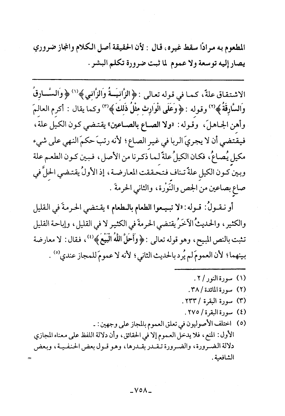الاشتقاق علة، كما في قوله تعالى: {الزَّانِيَةُ وَالزَّانِي} {وَالسَّارِقُ وَالسَّارِقَةُ} وقوله: {وَعَلَى الْوَارِثِ مِثْلُ ذَلِكَ} وكما يقال: أكرم العالم وأهن الجاهل، وقوله: "ولا الصاع بالصاعين" يقتضي كون الكيل علة، فيقتضي أن لا يجري الربا في غير الصاع؛ لأنه رتب حكم النهي على شيء مكيل يصاع، فكان الكيل علة لما ذكرنا من الأصل، فبين كون الطعم علة وبين كون الكيل علة تناف فتحققت المعارضة، إذ الأول يقتضي الحل في صاع بصاعين من الجص والنورة، والثاني الحرمة.