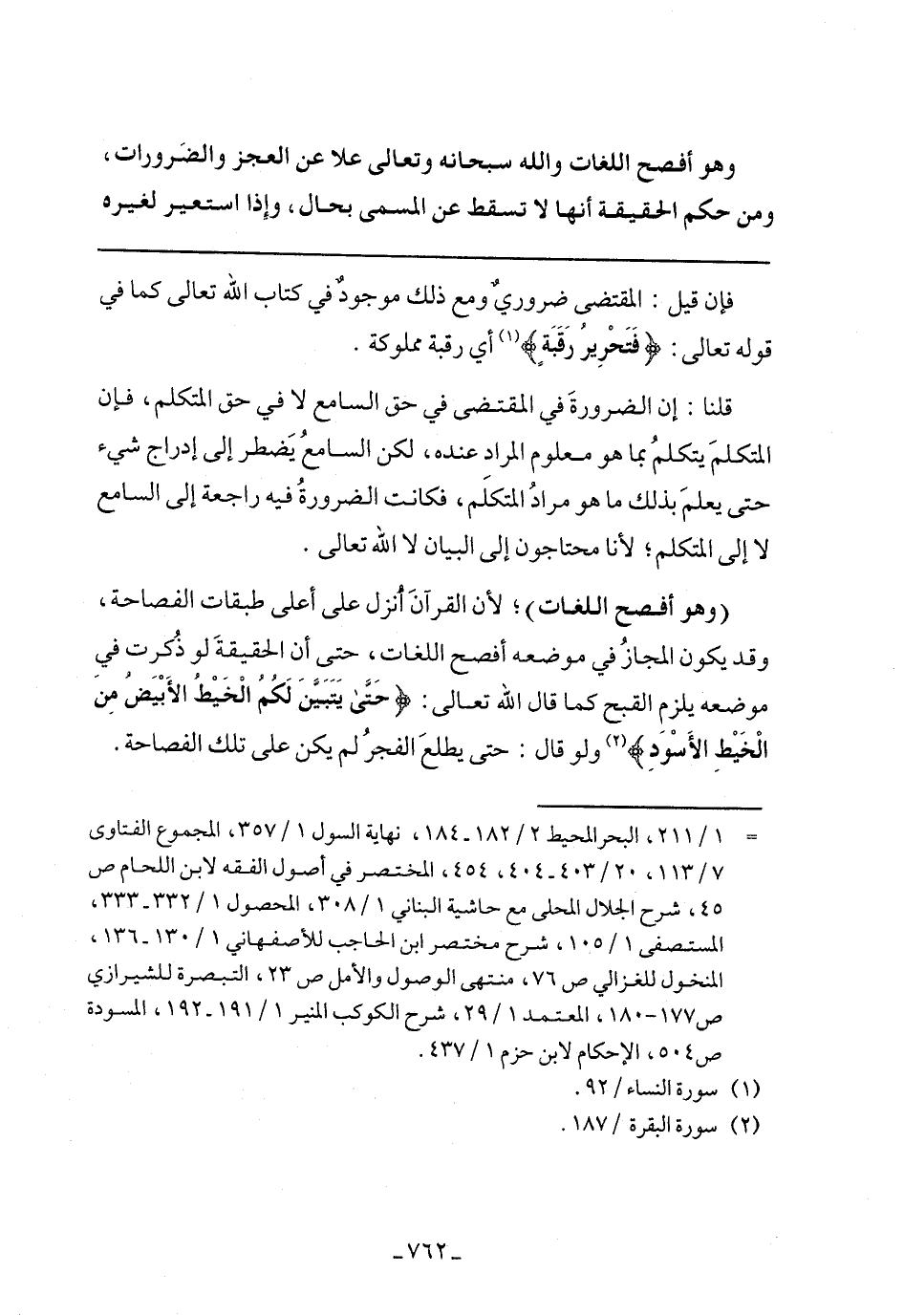 (وهو أفصح اللغات)؛ لأن القرآن أنزل على أعلى طبقات الفصاحة، وقد يكون المجاز في موضعه أفصح اللغات، حتى أن الحقيقة لو ذكرت في موضعه يلزم القبح كما قال الله تعالى: {حَتَّى يَتَبَيَّنَ لَكُمُ الْخَيْطُ الْأَبْيَضُ مِنَ الْخَيْطِ الْأَسْوَدِ} ولو قال: حتى يطلع الفجر لم يكن على تلك الفصاحة.