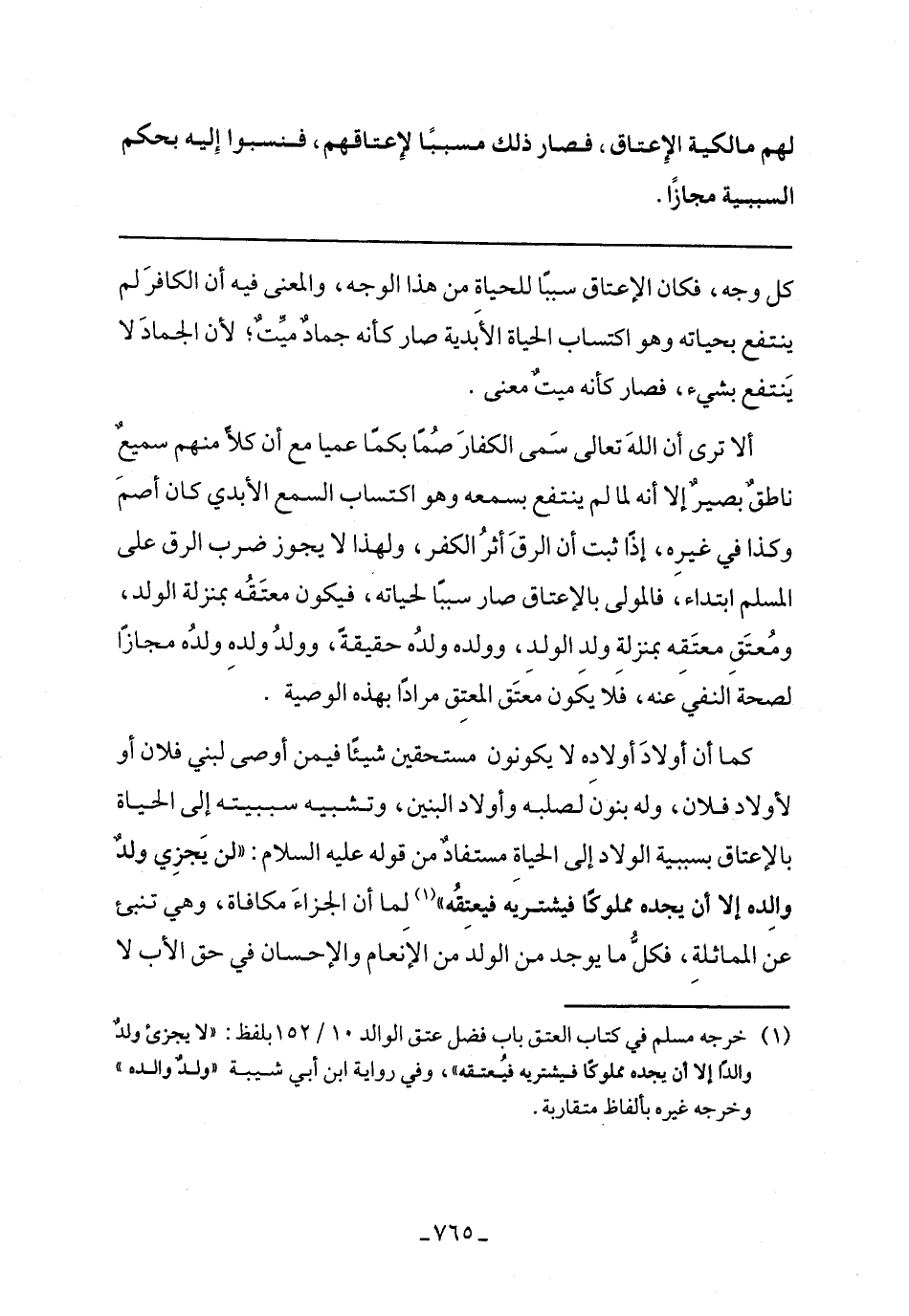 كما أن أولاد أولاده لا يكونون مستحقين شيئًا فيمن أوصى لبني فلان أو لأولاد فلان، وله بنون لصلبه وأولاد البنين، وتشبيه سببيته إلى الحياة بالإعتاق بسببية الولاد إلى الحياة مستفاد من قوله عليه السلام: "لن يجزي ولد والده إلا أن يجده مملوكًا فيشتريه فيعتقه" لما أن الجزاء مكافأة، وهي تنبئ عن المماثلة، فكل ما يوجد من الولد من الإنعام والإحسان في حق الأب لا