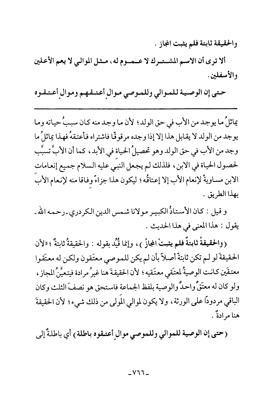 (والحقيقة ثابتة فلم يثبت المجاز)، وإنما قيد بقوله: والحقيقة ثابتة؛ "لأن الحقيقة لو لم تكن ثابتة أصلًا بأن لم يكن للموصي معتقون ولكن له معتقوا معتقين كانت الوصية لمعتقي معتقيه؛ لأن الحقيقة هنا غير مادة فيتعين المجاز، ولو كان له معتق واحد والوصية بلفظ الجماعة فاستحق هو نصف الثلث وكان الباقي مردودًا على الورثة، ولا يكون لموالي المولى من ذلك شيء؛ لأن الحقيقة هنا مرادة.
