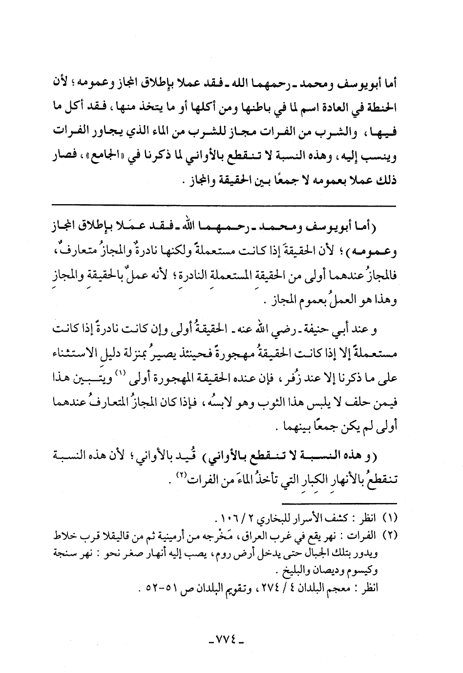 (أما أبو يوسف ومحمد- رحمهما الله- فقد عملا بإطلاق المجاز وعمومه)؛ لأنه الحقيقة إذا كانت مستعملة ولكنها نادرة والمجاز متعارف، فالمجاز عندهما أولى من الحقيقة والمستعملة النادرة؛ لأنه عمل بالحقيقة والمجاز وهذا هو العمل بعموم المجاز.