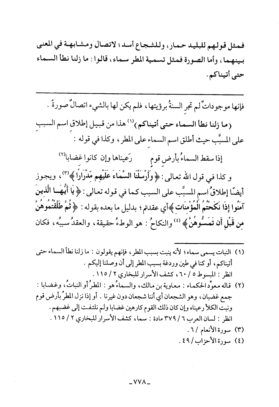 وكذا في قوله الله تعالى: {وَأَرْسَلْنَا السَّمَاءَ عَلَيْهِمْ مِدْرَارًا}، ويجوز أيضًا إطلاق اسم المسبب على السبب كما في قوله تعالى: {يَا أَيُّهَا الَّذِينَ آَمَنُوا إِذَا نَكَحْتُمُ الْمُؤْمِنَاتِ} أي عقدتم؛ بدليل ما بعده بقوله: {ثُمَّ طَلَّقْتُمُوهُنَّ مِنْ قَبْلِ أَنْ تَمَسُّوهُنَّ} والنكاح: هو الوطء حقيقة، والعقد سببه، فكان
