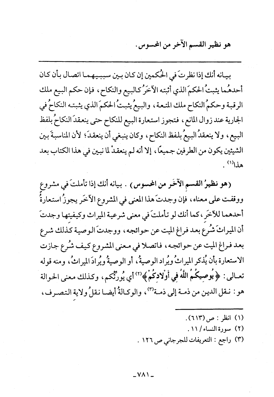 (هو نظير القسم الآخر من المحسوس). بيانه أنك إذا تأملت في مشروع ووقفت على معناه، فإن وجدت هذا المعنى في المشروع الآخر يجوز استعارة أحدهما للآخر، كما أنك لو تأملت في معنى شرعية الميراث وكيفيتها وجدت أن الميراث شرع بعد فراغ الميت عن حوائجه، ووجدت الوصية كذلك شرع بعد فراغ الميت عن حوائجه، فاتصلا في معنى المشروع كيف شرع جازت الاستعارة بأن يذكر الميراث ويراد الوصية، أو الوصية ويراد الميراث، ومنه قوله تعالى: {يُوصِيكُمُ اللَّهُ فِي أَوْلَادِكُمْ} أي يورثكم، وكذلك معنى الحوالة هو: نقل الدين من ذمة إلى ذمة، والوكالة أيضًا نقل ولاية التصرف،