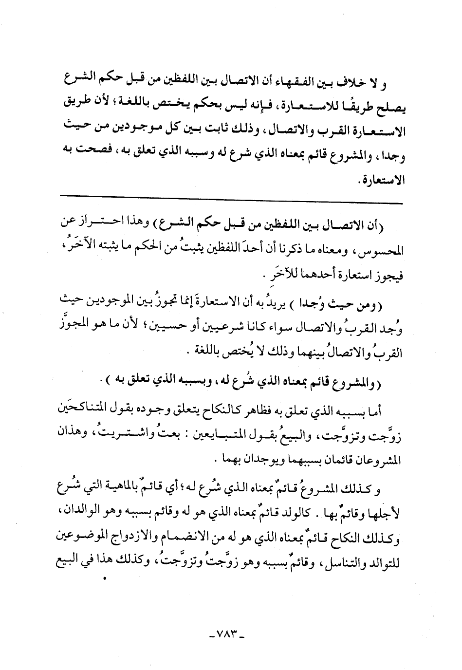 (أن الاتصال بين اللفظين من قبل حكم الشرع) وهذا احتراز عن المحسوس، ومعناه ما ذكرنا أن أحد اللفظين يثبت من الحكم ما يثبته الآخر، فيجوز استعارة أحدهما للآخر.