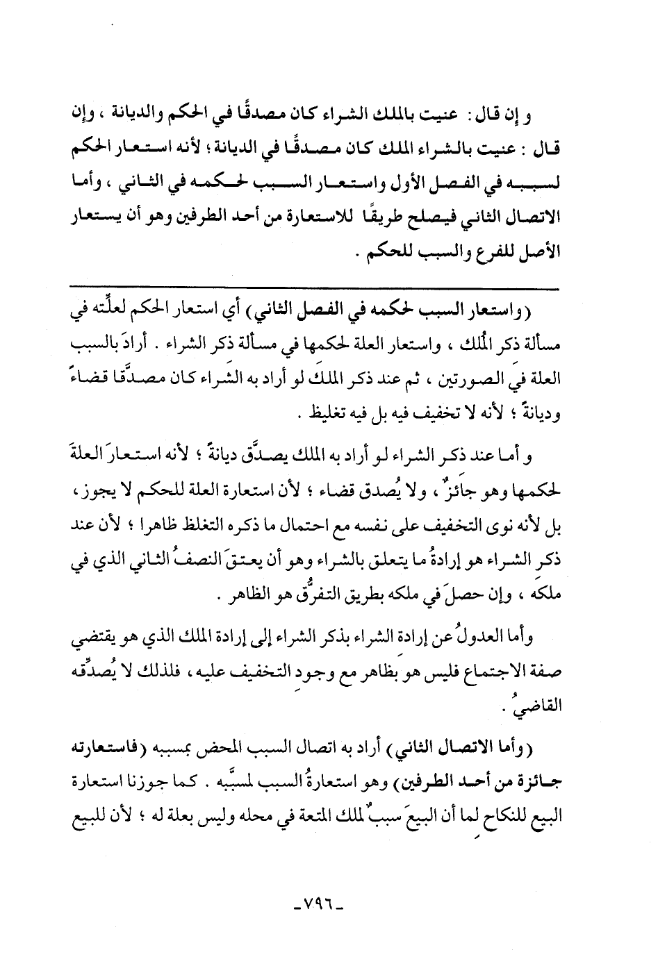 (واستعار السبب لحكمه في الفصل الثاني) أي استعار الحكم لعلته في مسألة ذكر الملك، واستعار العلة لحكمها في مسألة ذكر الشراء. أراد بالسبب العلة في الصورتين، ثم عند ذكر الملك لو أراد به الشراء كان مصدقًا قضاء وديانة؛ لأنه لا تخفيف فيه بل فيه تغليظ.