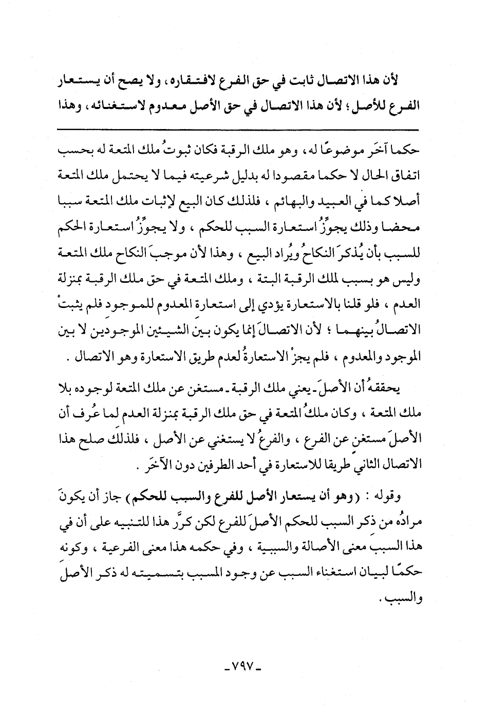 يحققه أن الأصل- يعني ملك الرقبة- مستغن عن ملك المتعة لوجوده بلا ملك المتعة، وكان ملك المتعة في حق ملك الرقبة بمنزلة العدم لما عرف أن الأصل مستغن عن الفرع، والفرع لا يستغنى عن الأصل، فلذلك صلح هذا الاتصال الثاني طريقا للاستعارة في أحد الطرفين دون الآخر.