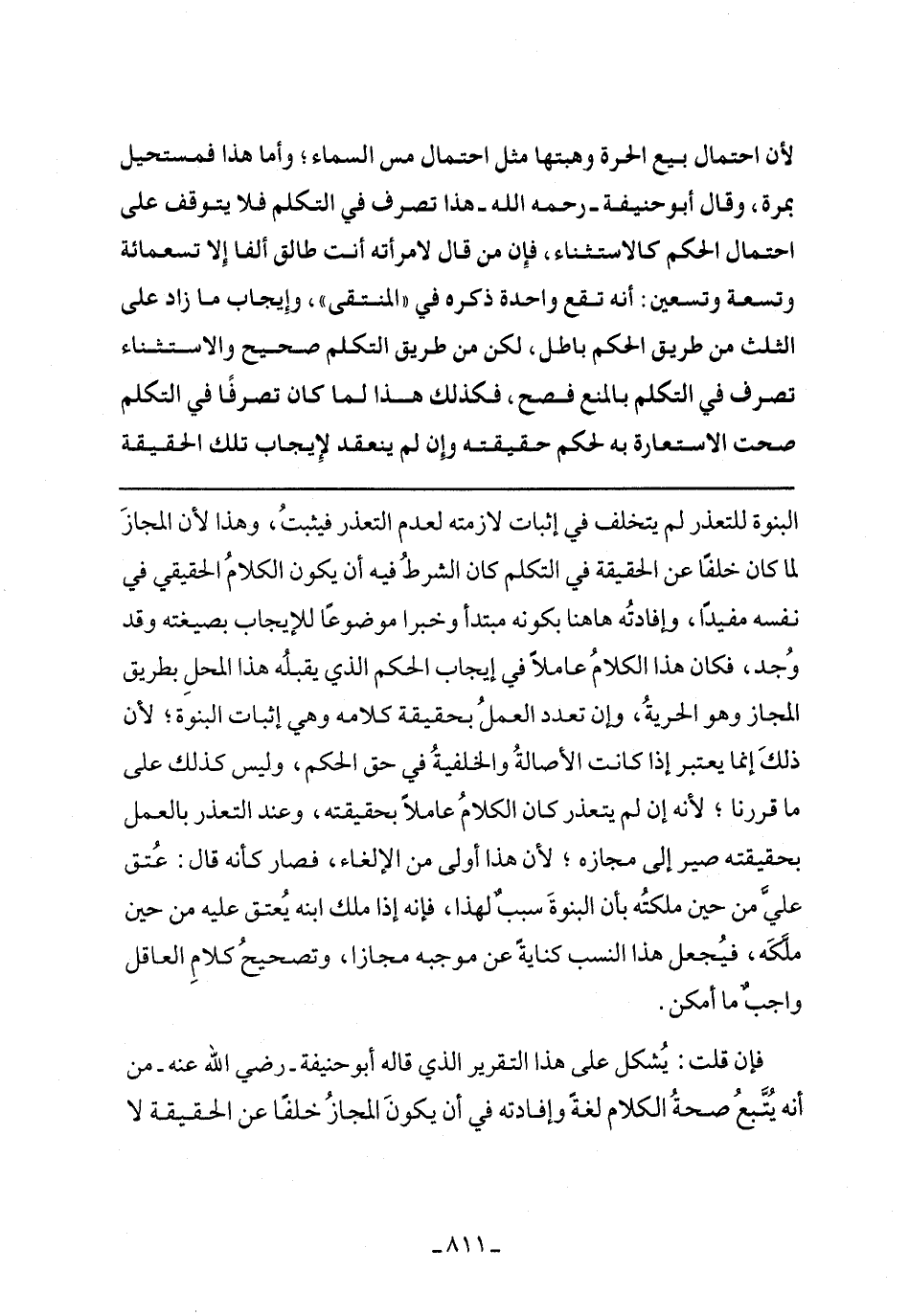 فإن قلت: يشكل على هذا التقرير الذي قاله أبو حنيفة- رضي الله عنه- من أنه يتبع صحة الكلام لغة وأفادته في أن يكون المجاز خلفا عن الحقيقة لا