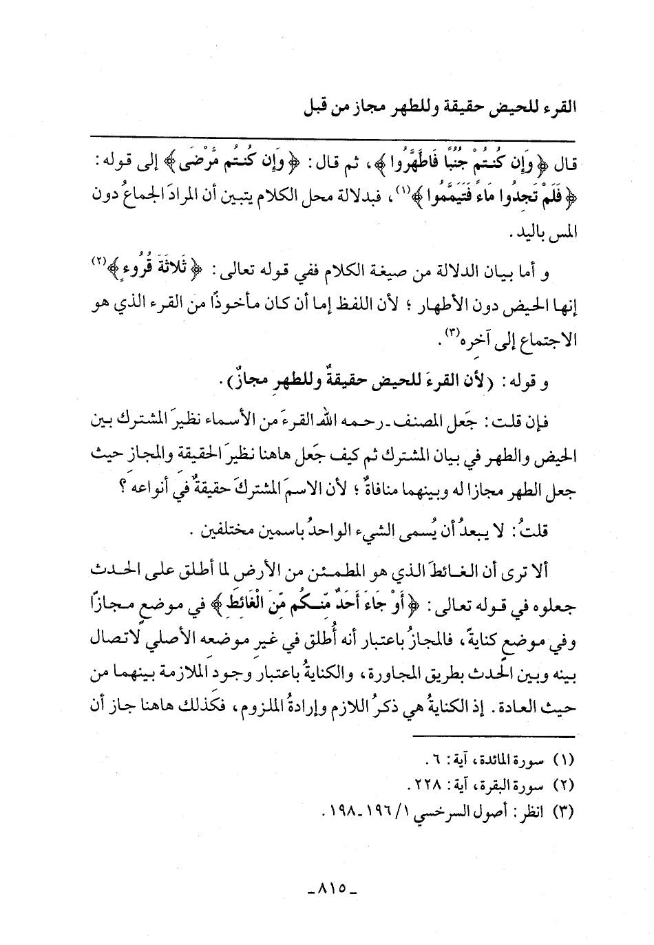 وأما بيان الدلالة من صيغة الكلام ففي قوله تعالى:} ثَلاثَةَ قُرُوءٍ {إنها الحيض دون الأطهار؛ لأن اللفظ إما أن كان مأخوذا من القرء الذي هو الاجتماع إلى آخره.