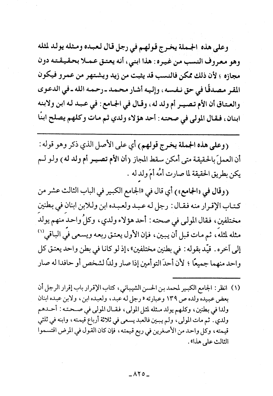 (وقال في "الجامع") أي قال في "الجامع الكبير في الباب الثالث عشر من كتاب الإقرار منه فقال: رجل له عبد ولعبده ابن وللابن ابنان في بطنين مختلفتين، فقال المولى في صحته: أحد هؤلاء ولدي، وكل واحد منهم يولد مثله لمثله، ثم مات قبل أن يبين، فإن الأول يعتق ربعه ويسعى في الباقي إلى آخره. قيد بقوله: في بطنين مختلفين"، إذ لو كانا في بطن واحد يعتق كل واحد منهما جميعا؛ لأن أحد التوأمين إذا صار ولدا لشخص أو حافدا له صار