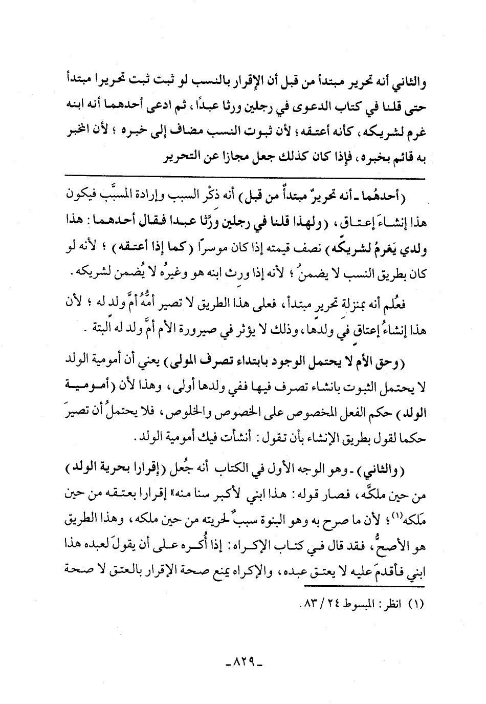 (أحدهما - أنه تحرير مبتدأ من قبل) أنه ذكر السبب وإرادة المسبب فيكون هذا إنشاء إعتاق، (ولهذا قلنا في رجلين ورثا عبدا فقال أحدهما: هذا ولدي يغرم لشريكه) نصف قيمته إذا كان موسرا (كما إذا أعتقه)؛ لأنه لو كان بطريق النسب لا يضمن؛ لأنه إذا ورث ابنه هو وغيره لا يضمن لشريكه.