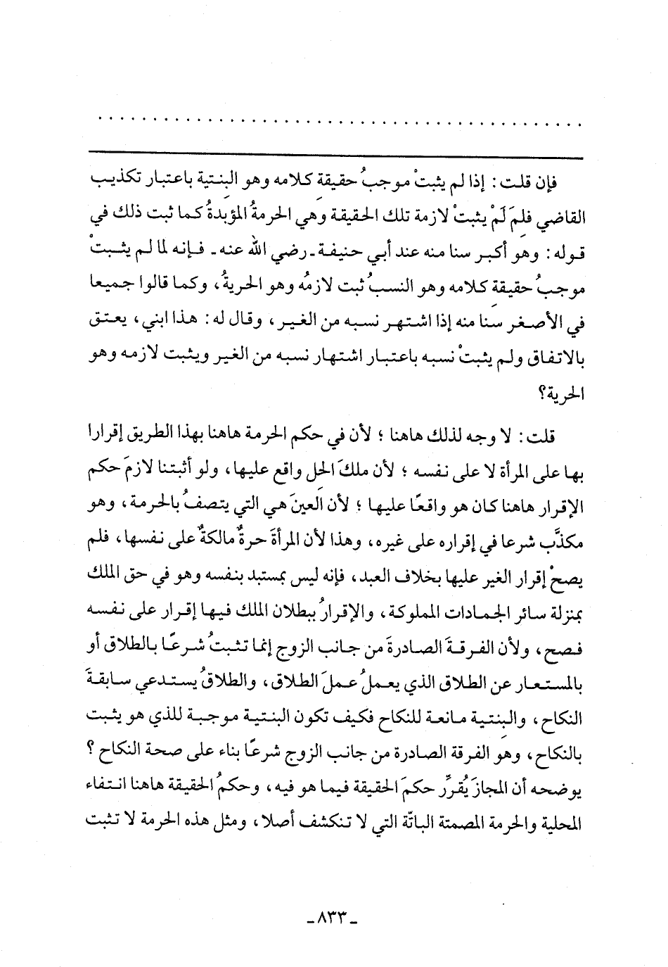 قلت: لا وجه لذلك هاهنا؛ لأن في حكم الحرمة ها هنا بهذا الطريق إقرارا بها على المرأة لا على نفسه؛ لأن ملك الحل واقع عليها، ولو أثبتنا لازم حكم الإقرار ها هنا كان هو واقعا عليها؛ لأن العين هي التي يتصف بالحرمة، وهو مكذب شرعا في إقراره على غيره، وهذا لأن المرأة حرة مالكة على نفسها، فلم يصح إقرار الغير عليها بخلاف العبد، فإنه ليس بمستبد بنفسه وهو في حق الملك بمنزلة سائر الجمادات المملوكة، والإقرار ببطلان الملك فيها إقرار على نفسه فصح، ولأن الفرقة الصادرة من جانب الزوج إنما تثبت شرعا بالطلاق أو بالمستعار عن الطلاق الذي يعمل عمل الطلاق، والطلاق يستدعي سابقة النكاح، والبنتية مانعة للنكاح فكيف تكون البنتية موجبة للذي هو يثبت بالنكاح، وهو الفرقة الصادرة من جانب الزوج شرع بناء على صحة النكاح؟ يوضحه أن المجاز يقرر حكم الحقيقة فيما هو فيه، وحكم الحقيقة ها هنا انتفاء المحلية والحرمة المصمتة الباتة التي لا تنكشف أصلا، ومثل هذه الحرمة لا تثبت
