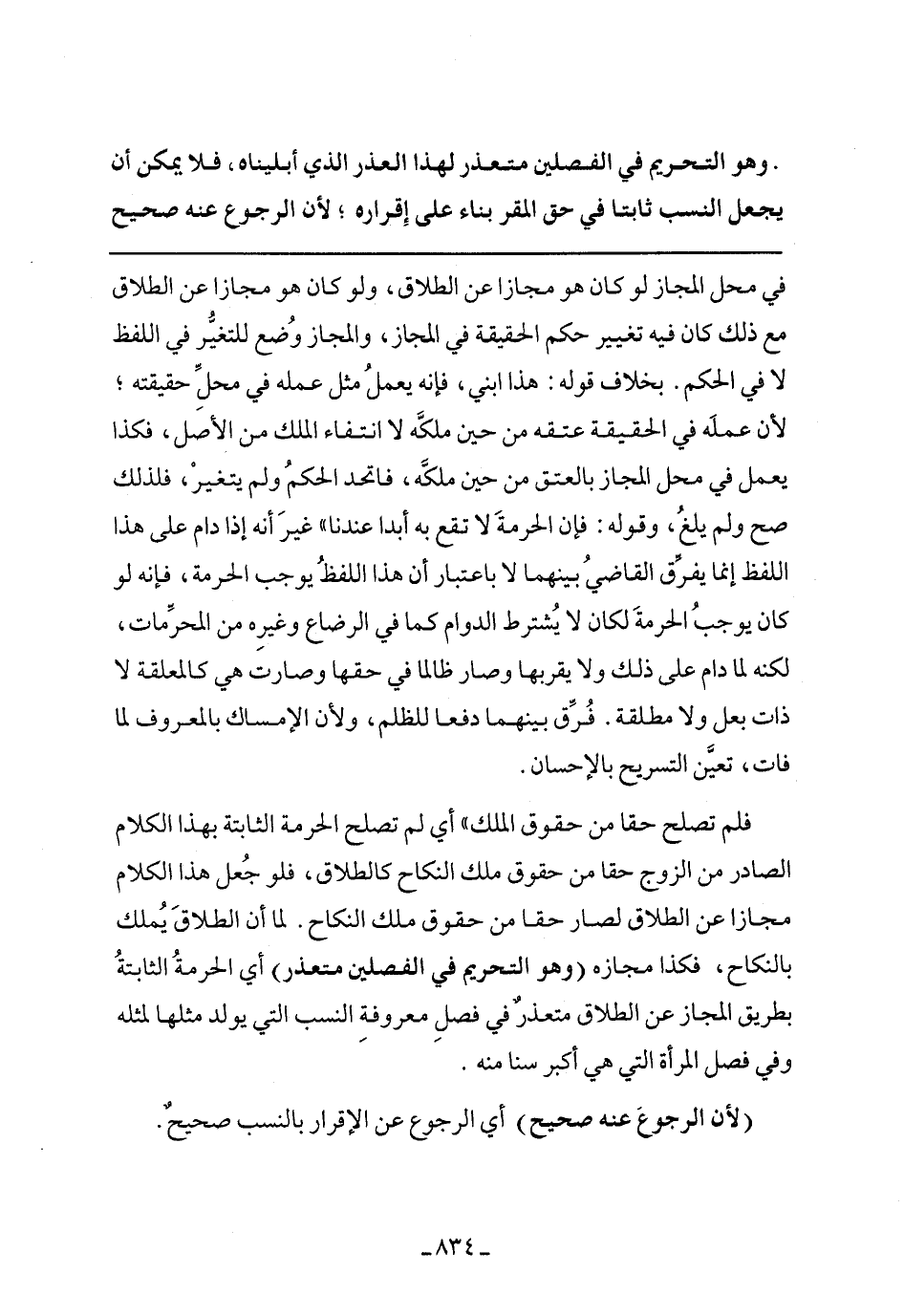 فلم تصلح حقا من حقوق الملك" أي لم تصلح الحرمة الثابتة بهذا الكلام الصادر من الزوج حقا من حقوق ملك النكاح كالطلاق، فلو جعل هذا الكلام مجازا عن الطلاق لصار حقا من حقوق ملك النكاح. لما أن الطلاق يملك بالنكاح، فكذا مجازه (وهو التجريم في الفصلين متعذر) أي الحرمة الثابتة بطريق المجاز عن الطلاق متعذر في فصل معروفة النسب التي يولد مثلها لمثله وفي فصل المرأة التي هي أكبر سنا منه.