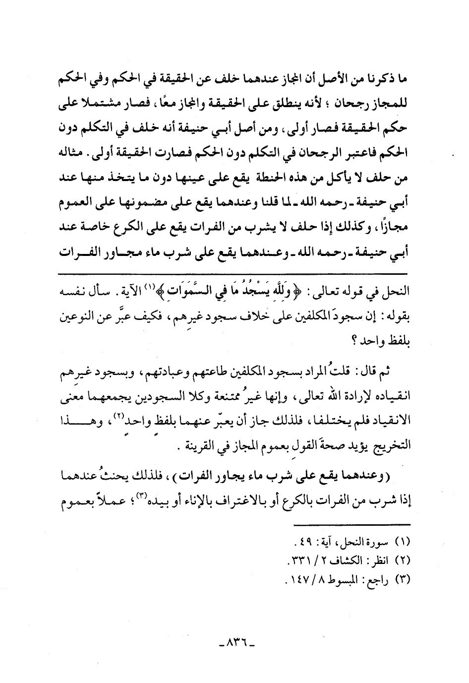 ثم قال: قلت المراد بسجود المكلفين طاعتهم وعبادتهم، وبسجود غيرهم انقياده لإرادة الله تعالى، وأنها غير ممتنعة وكلا السجودين يجمعهما معنى الانقياد فلم يختلفا، فلذلك جاز أن يعبر عنهما بلفظ واحد، وهذا التخريج يؤيد صحة القول بعموم المجاز في القرينة.