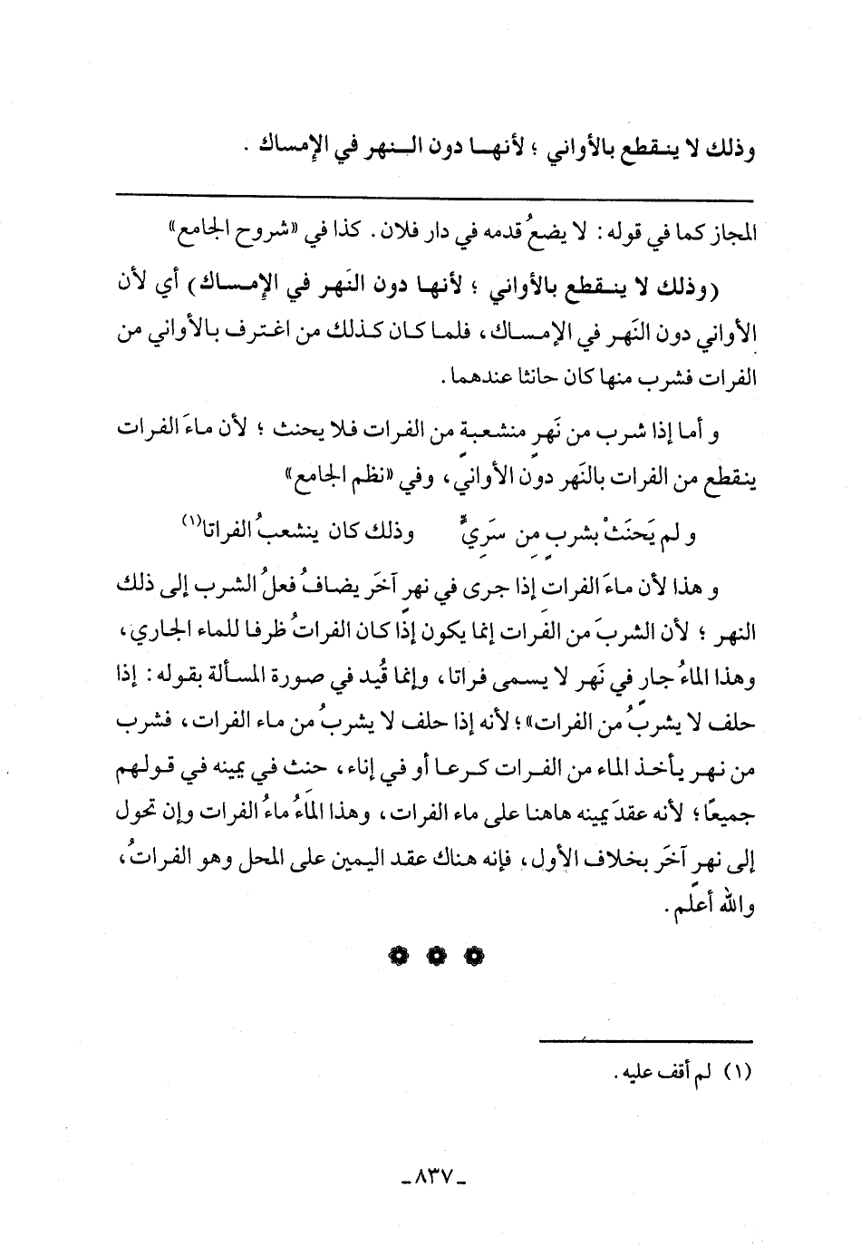 (وذلك لا ينقطع بالأواني؛ لأنها دون النهر في الإمساك) أي لأن الأواني دون النهر في الإمساك، فلما كان كذلك من اغترف بالأواني من الفرات فشرب منها كان حانث عندهما.