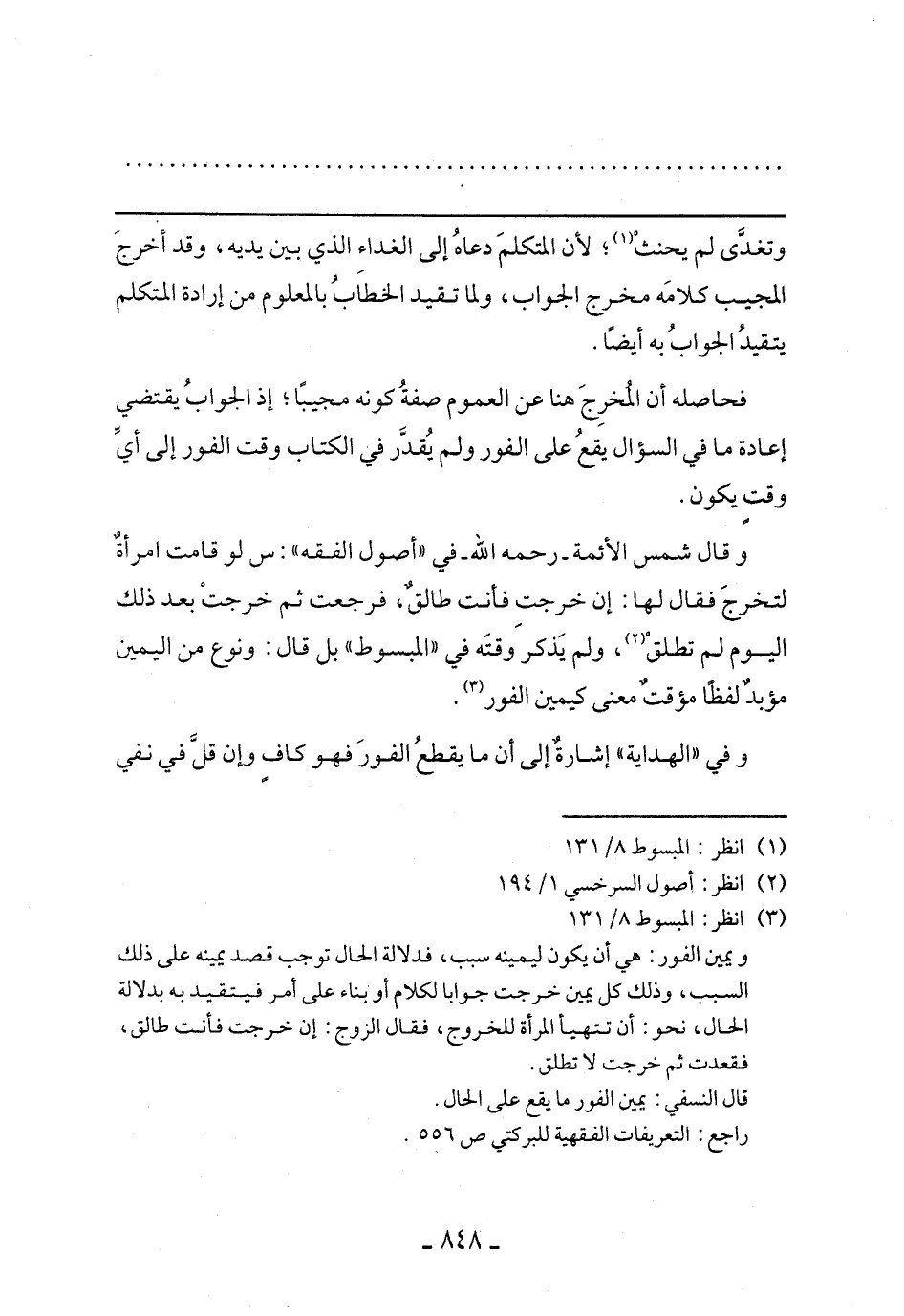 وقال شمس الأئمة- رحمه الله- في "أصول الفقه": س لو قامت امرأة لتخرج فقال لها: إن خرجت فأنت طالق، فرجعت ثم خرجت بعد ذلك اليوم لم تطلق، ولم يذكر وقته في "المبسوط" بل قال: ونوع من اليمين مؤبد لفظا مؤقت معنى كيمين الفور.