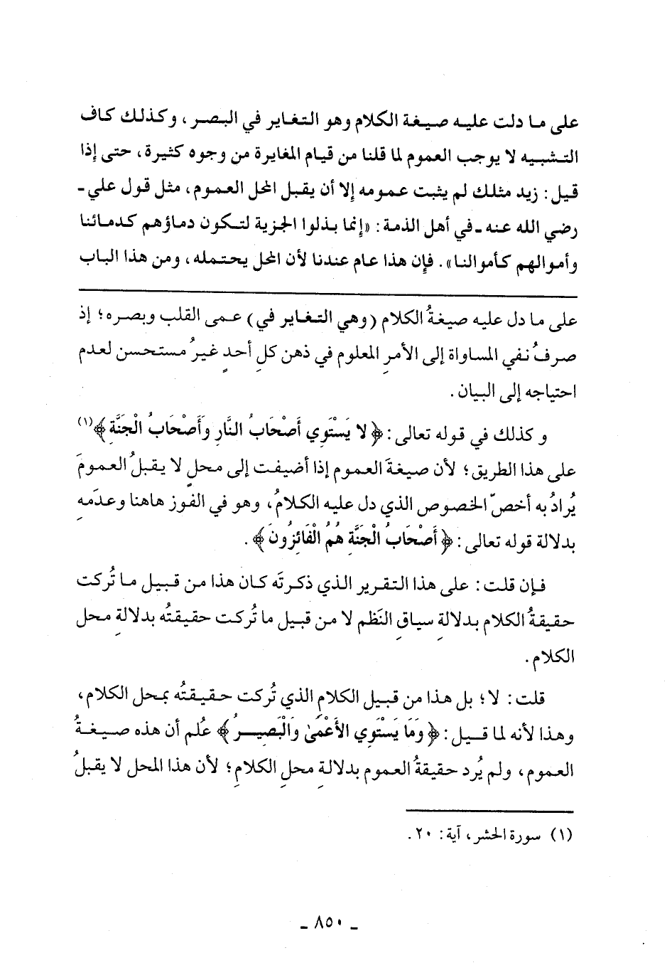 وكذلك في قوله تعالى:} لا يَسْتَوِي أَصْحَابُ النَّارِ وأَصْحَابُ الجَنَّةِ {على هذا الطريق؛ لأن صيغة العموم إذا أضيفت إلى محل لا يقبل العموم يراد به أخص الخصوص الذي دل عليه الكلام، وهو في الفوز ها هنا وعدمه بدلالة قوله تعالى:} أَصْحَابُ الجَنَّةِ هُمُ الفَائِزُونَ {.